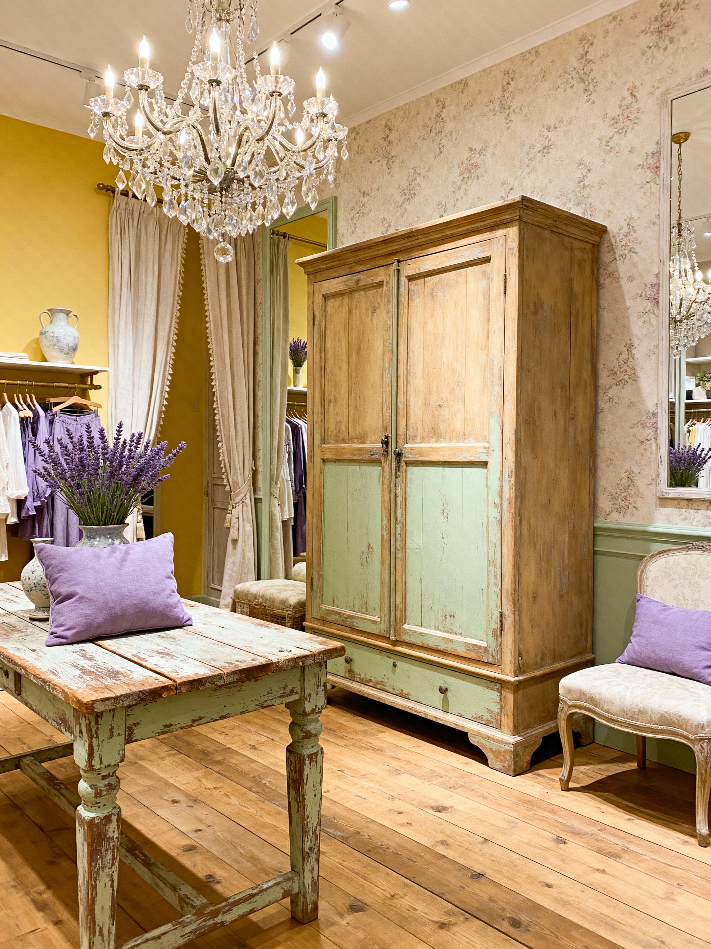 clothing store with french country style . with country elegance and vintage furniture and warm tones and distressed wood and chandeliers and lavender accents and soft fabrics and textured walls