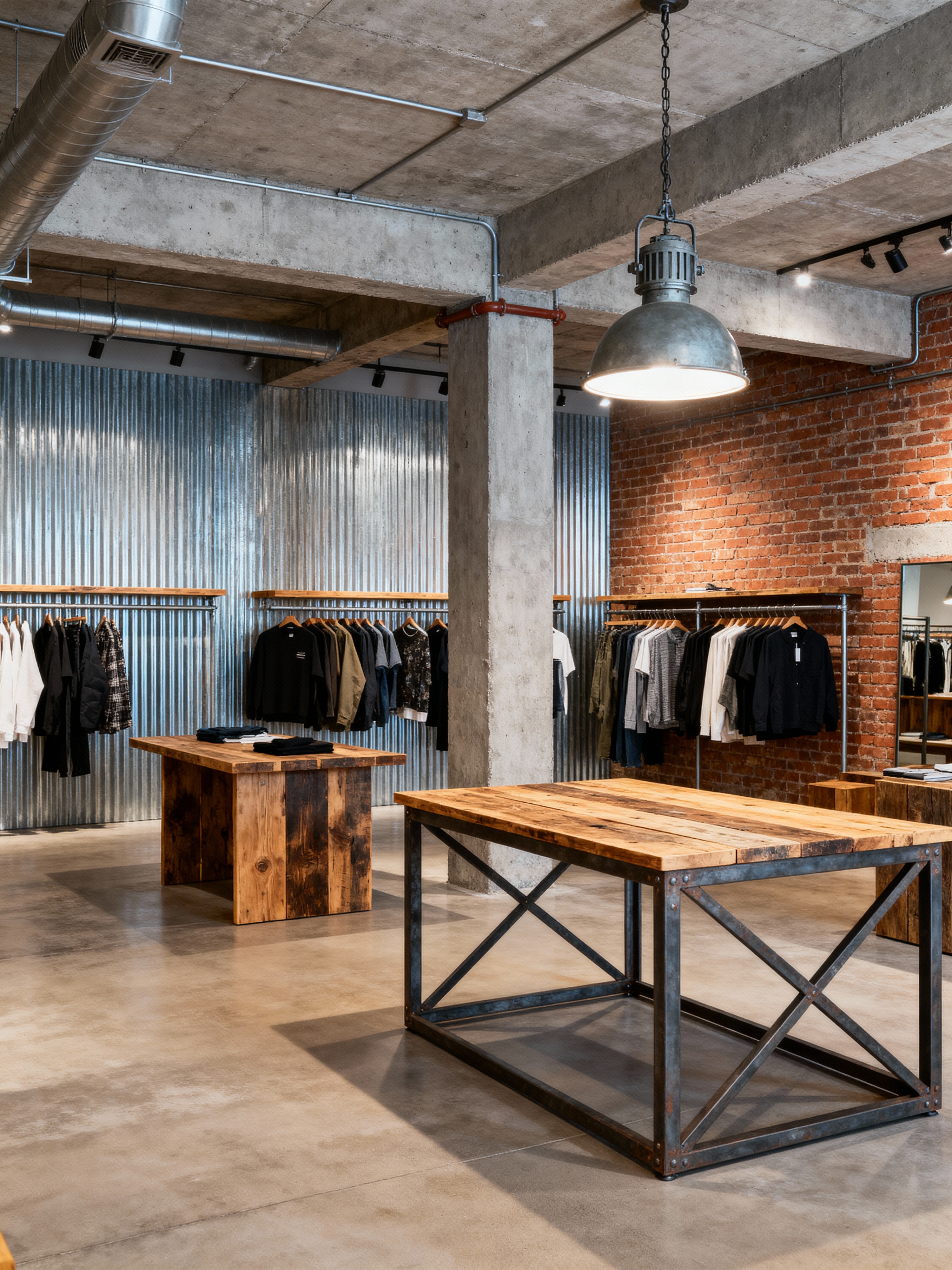 clothing store with industrial style . with open floorplan and utilitarian objects and reclaimed wood and raw aesthetic and metal panels and factory style and exposed concrete and exposed brick