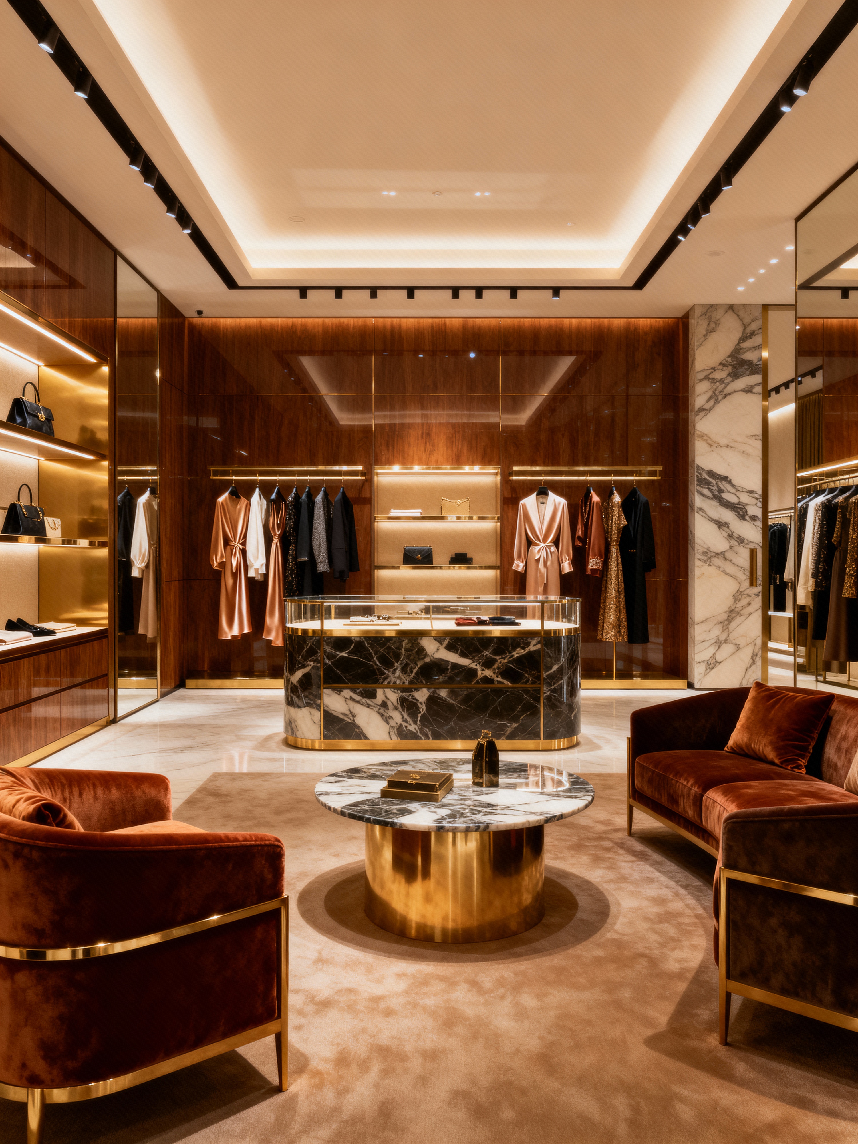clothing store with luxury style . with elegant lighting and designer furniture and expensive fabrics and sophisticated style and custom pieces and lavish comfort and rich textures and high-end materials