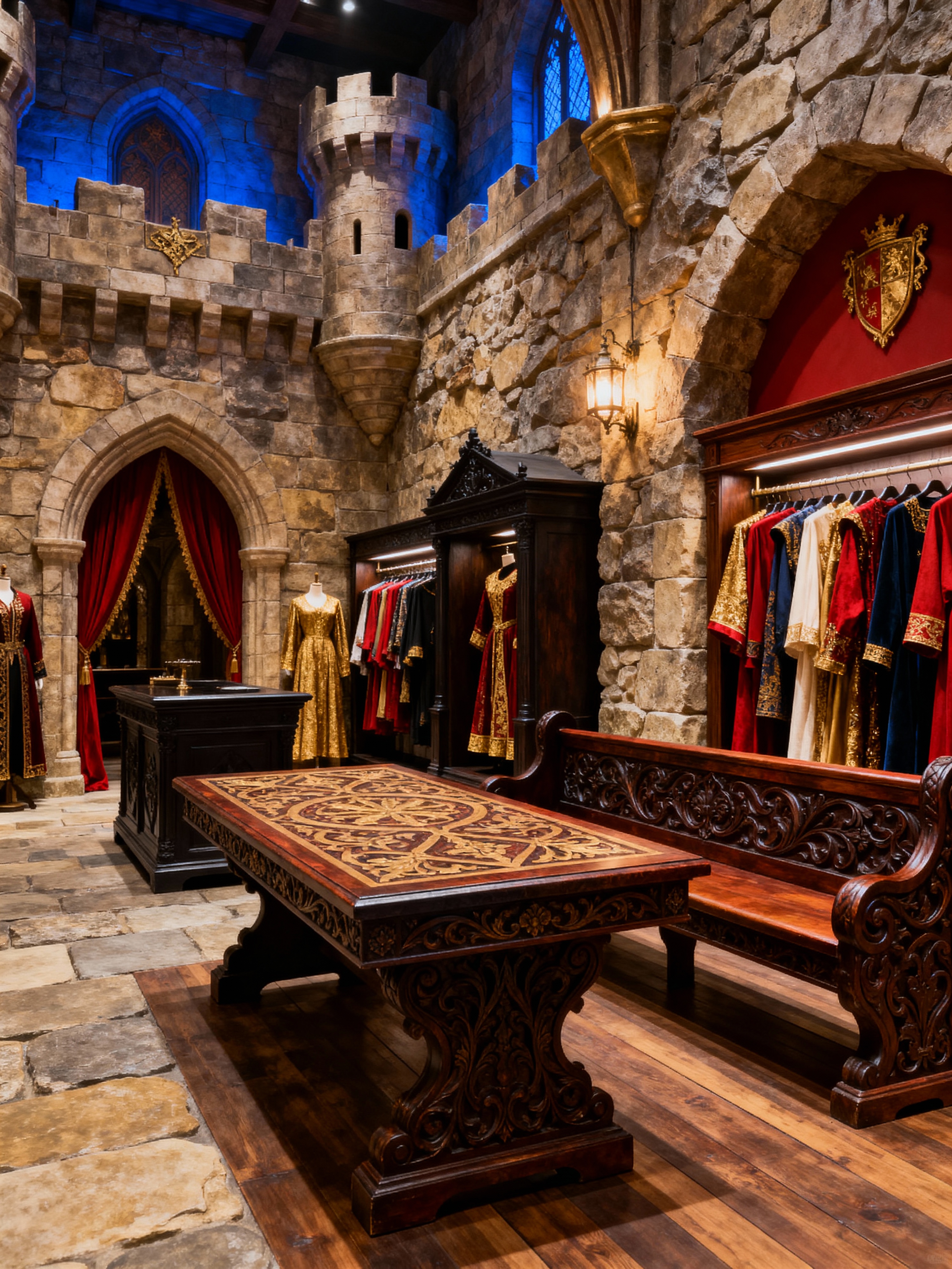 clothing store with medieval style . with castle interior and stone or wooden floor and carved wooden tables and heavy furniture pieces and stone walls and deep colors like red, gold, or blue and castle interior and carved wooden benches
