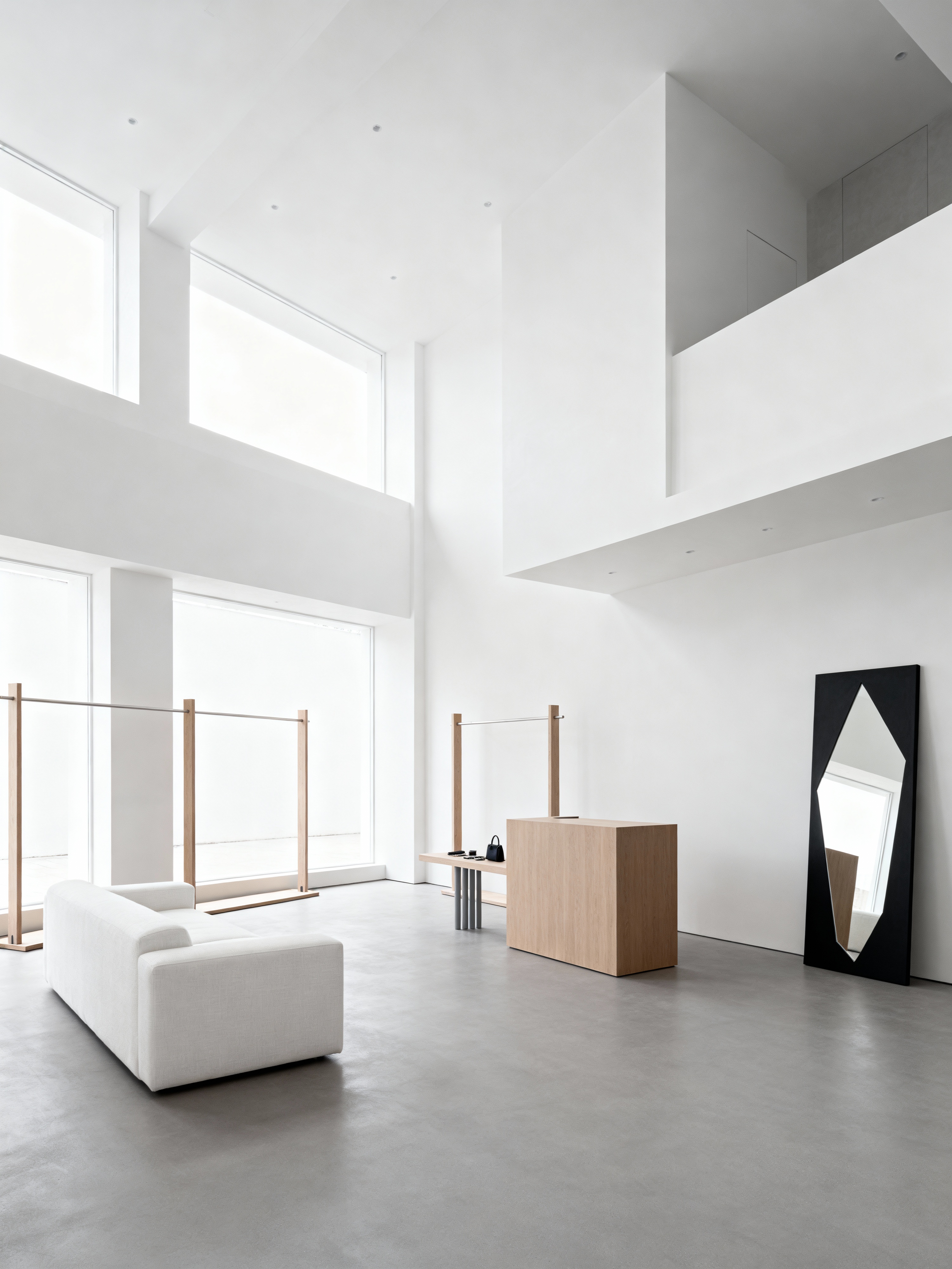 clothing store with minimalist style . with focus on the shape, colour and texture of just a few of essential elements and a monochromatic palette with colour used as an accent and clean lines and an open floor plan and lots of light and functional furniture and focus on the shape, colour and texture of just a few of essential elements