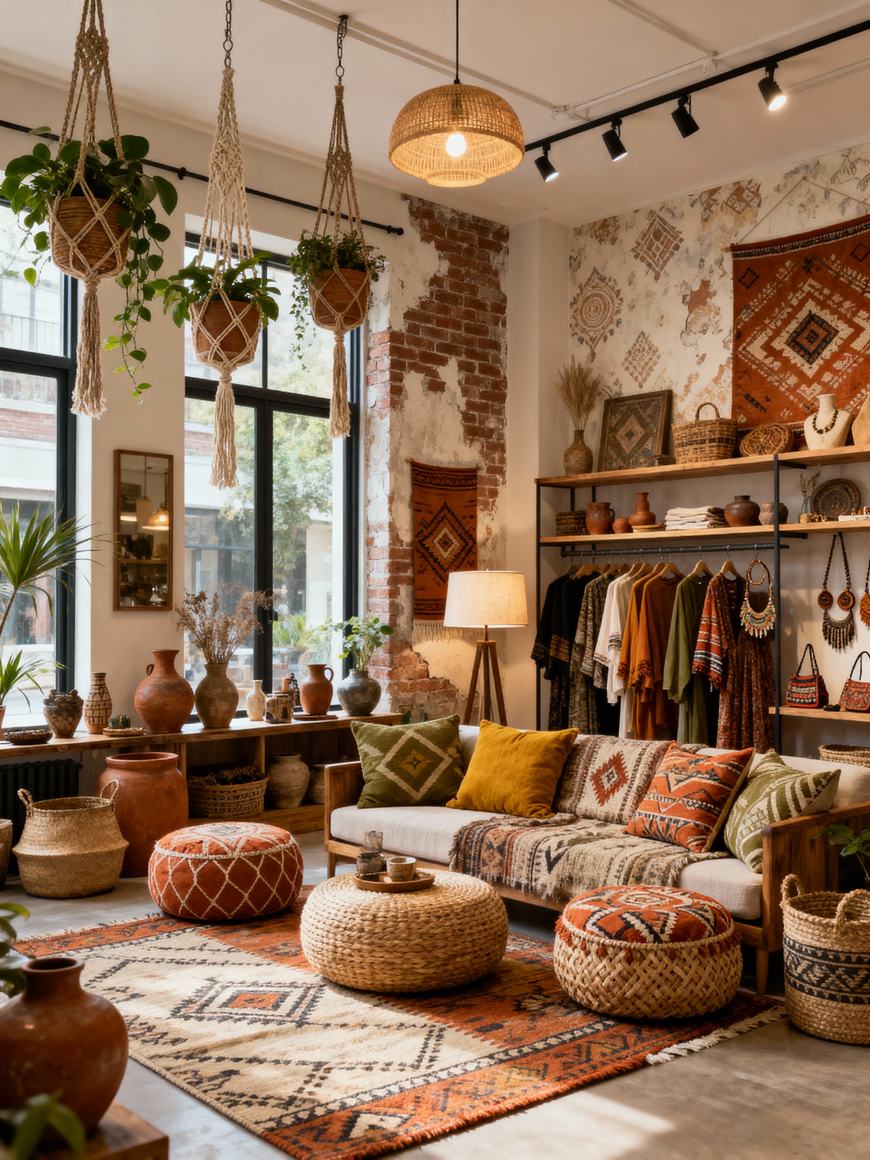 clothing store with modern boho style . with wood decor and woven textures and airy space and patterns and expressive decor and collected look and hanging plants and handcrafted items