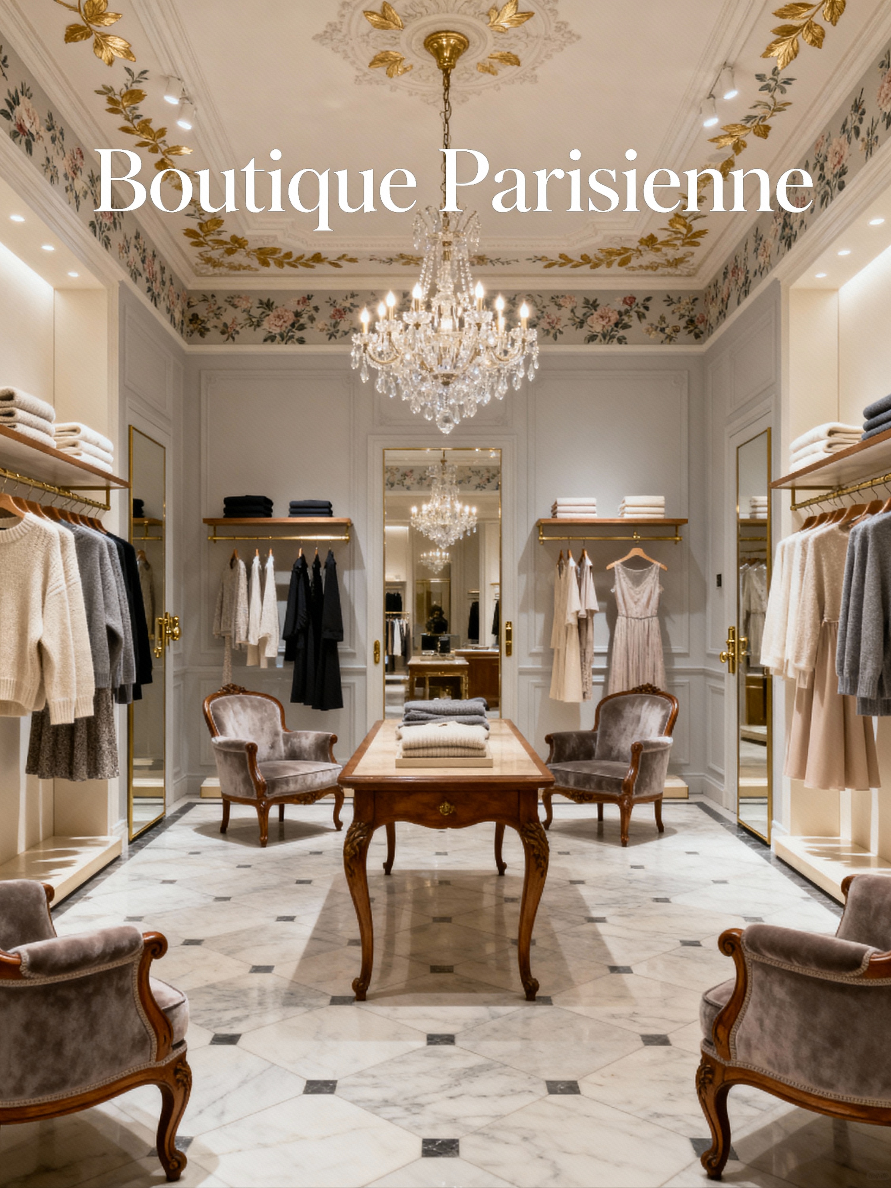 clothing store with parisian style . with ornate moldings and neutral palette and antique furniture and chic simplicity and sophisticated charm and timeless beauty and refined style and classic details