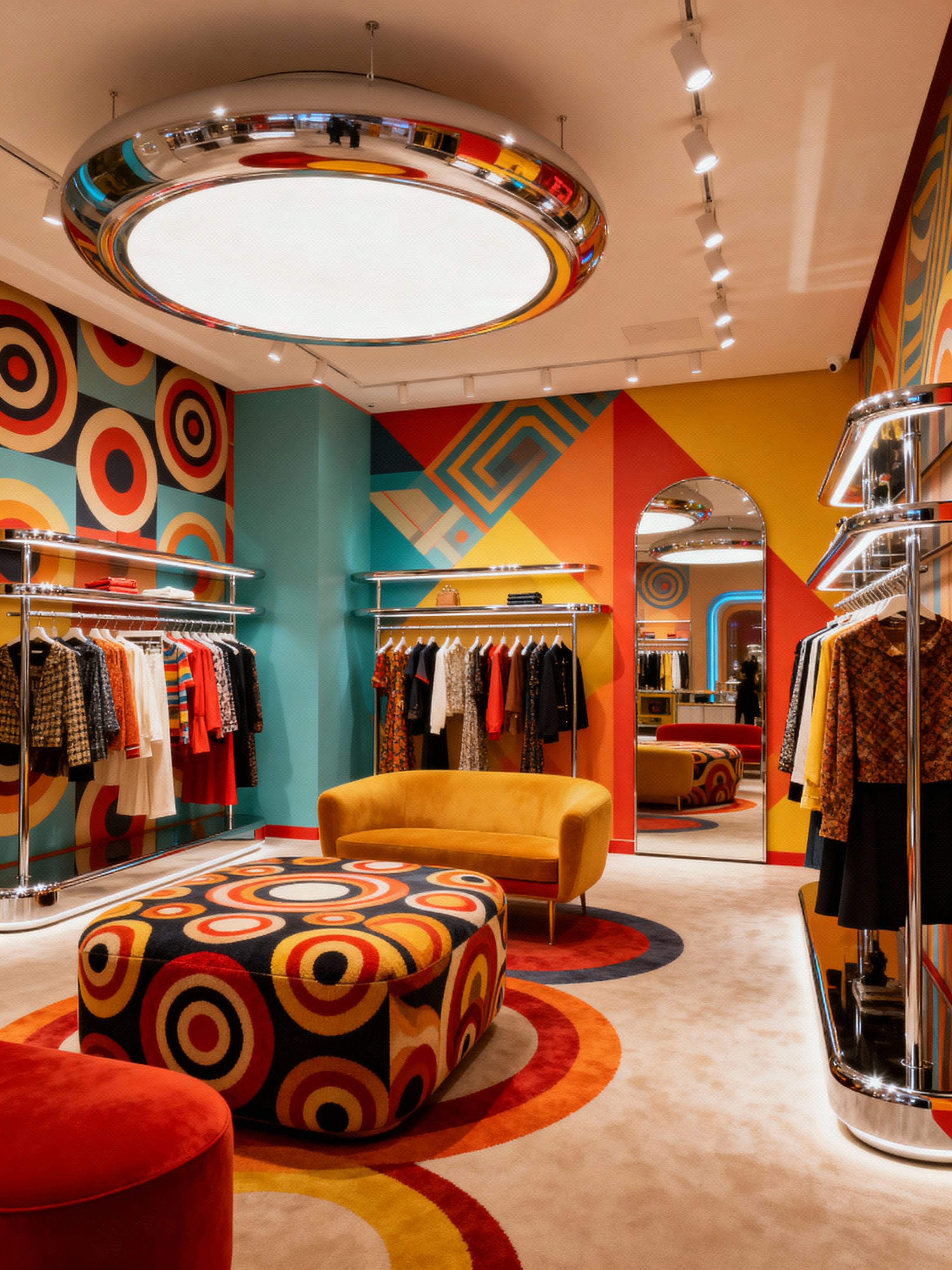clothing store with retro style . with nostalgic pieces and mod style and geometric shapes and space age and bright colors and bold patterns and groovy vibes and chrome accents