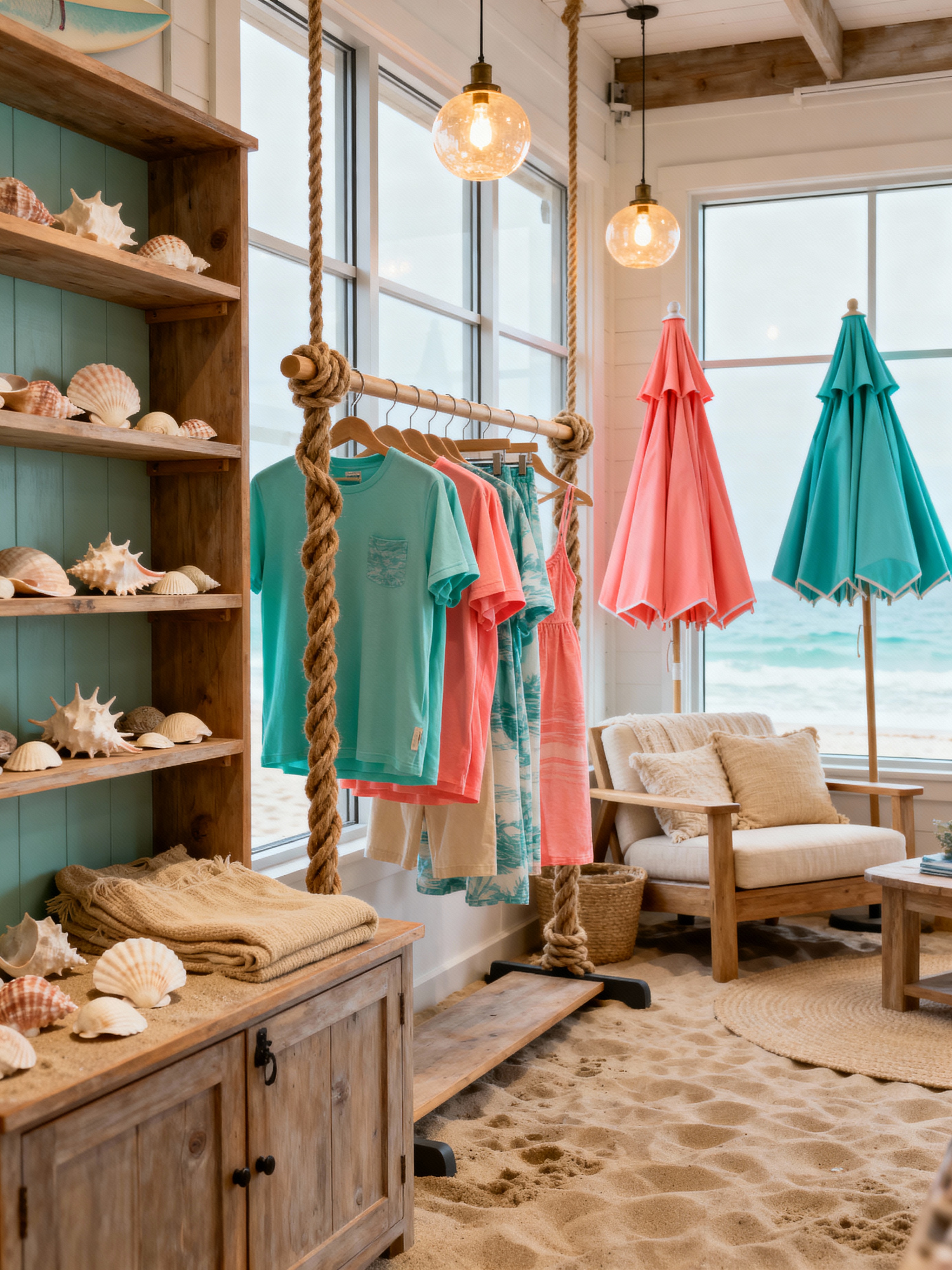 clothing store with surf shack style . with seashells and rope details and ocean-inspired colors and coastal lighting and beach umbrellas and beach vibes and sand-colored textiles and nautical rope
