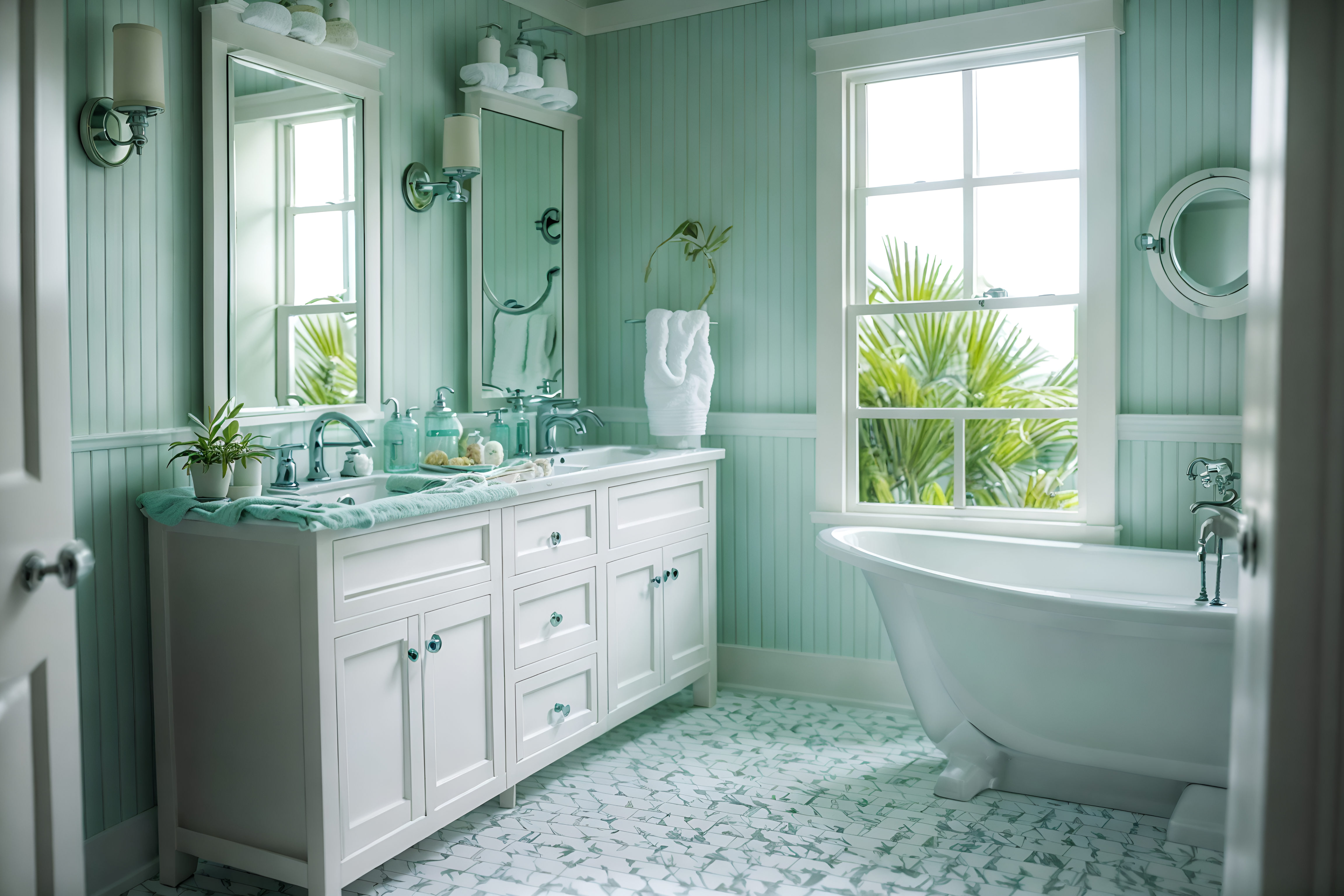 photo from pinterest of coastal-style interior designed (bathroom interior) with waste basket and mirror and bathroom sink with faucet and plant and bath rail and bathroom cabinet and bathtub and toilet seat. . with . . cinematic photo, highly detailed, cinematic lighting, ultra-detailed, ultrarealistic, photorealism, 8k. trending on pinterest. coastal interior design style. masterpiece, cinematic light, ultrarealistic+, photorealistic+, 8k, raw photo, realistic, sharp focus on eyes, (symmetrical eyes), (intact eyes), hyperrealistic, highest quality, best quality, , highly detailed, masterpiece, best quality, extremely detailed 8k wallpaper, masterpiece, best quality, ultra-detailed, best shadow, detailed background, detailed face, detailed eyes, high contrast, best illumination, detailed face, dulux, caustic, dynamic angle, detailed glow. dramatic lighting. highly detailed, insanely detailed hair, symmetrical, intricate details, professionally retouched, 8k high definition. strong bokeh. award winning photo.