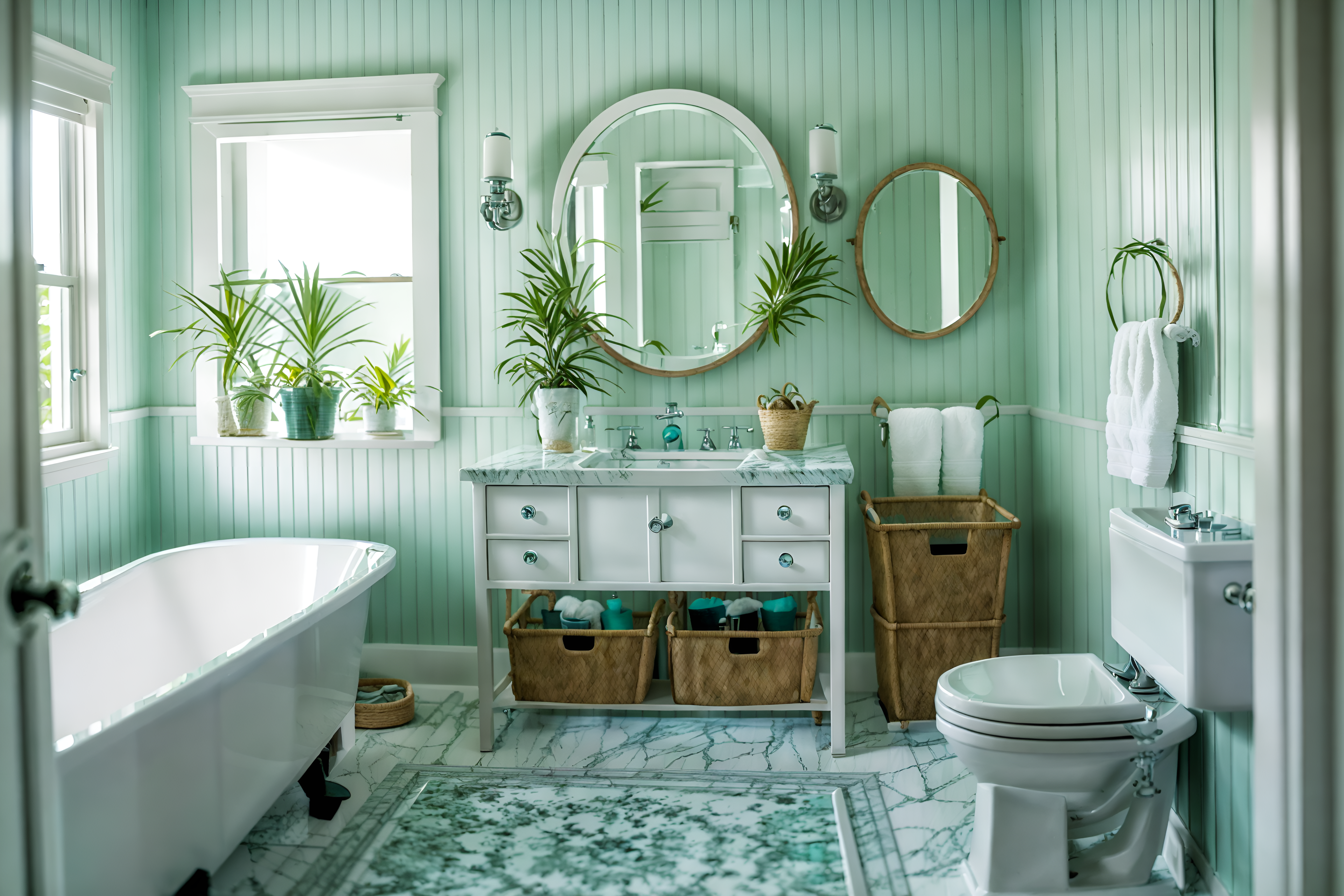 photo from pinterest of coastal-style interior designed (bathroom interior) with waste basket and mirror and bathroom sink with faucet and plant and bath rail and bathroom cabinet and bathtub and toilet seat. . with . . cinematic photo, highly detailed, cinematic lighting, ultra-detailed, ultrarealistic, photorealism, 8k. trending on pinterest. coastal interior design style. masterpiece, cinematic light, ultrarealistic+, photorealistic+, 8k, raw photo, realistic, sharp focus on eyes, (symmetrical eyes), (intact eyes), hyperrealistic, highest quality, best quality, , highly detailed, masterpiece, best quality, extremely detailed 8k wallpaper, masterpiece, best quality, ultra-detailed, best shadow, detailed background, detailed face, detailed eyes, high contrast, best illumination, detailed face, dulux, caustic, dynamic angle, detailed glow. dramatic lighting. highly detailed, insanely detailed hair, symmetrical, intricate details, professionally retouched, 8k high definition. strong bokeh. award winning photo.