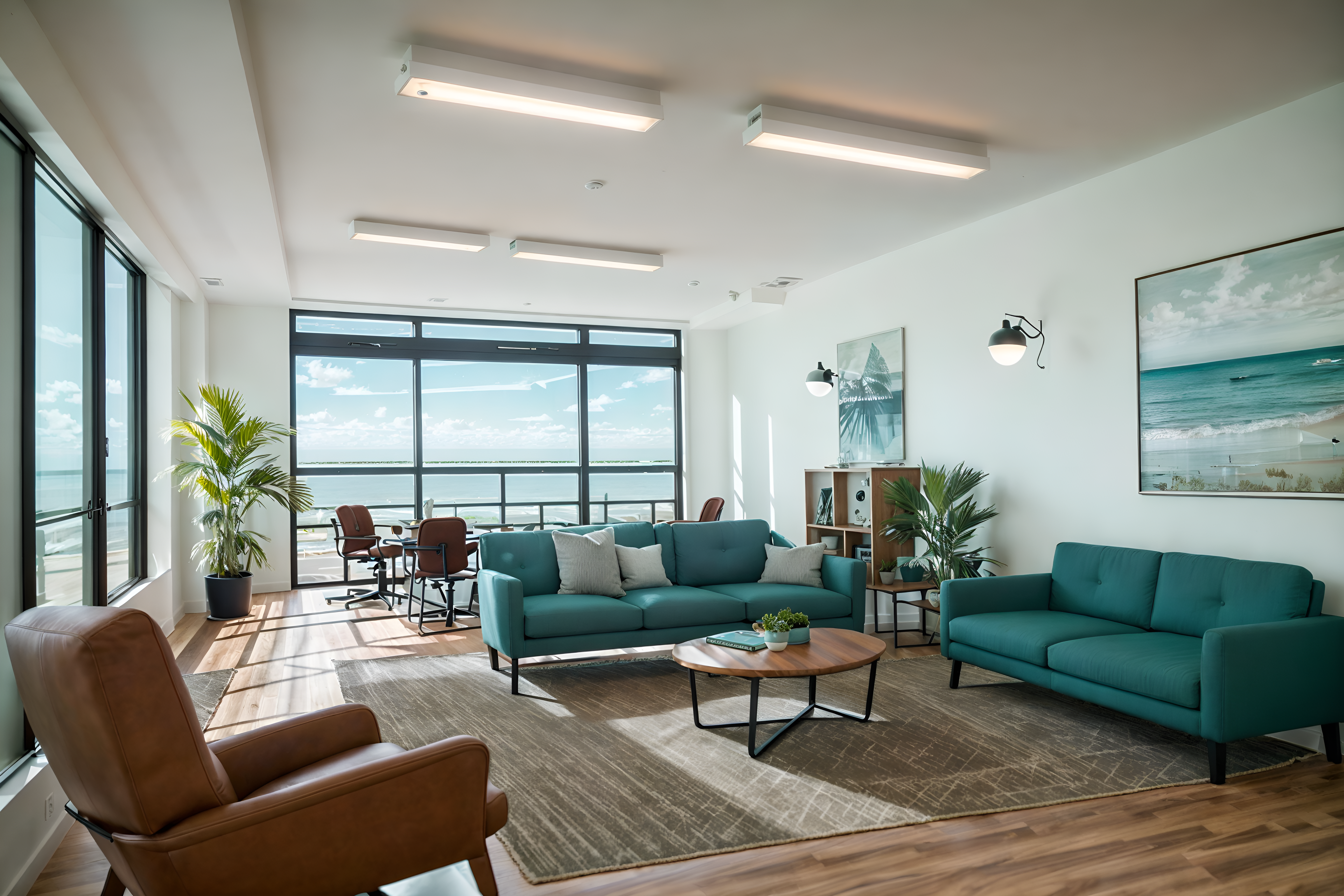 photo from pinterest of coastal-style interior designed (coworking space interior) with seating area with sofa and office chairs and lounge chairs and office desks and seating area with sofa. . with . . cinematic photo, highly detailed, cinematic lighting, ultra-detailed, ultrarealistic, photorealism, 8k. trending on pinterest. coastal interior design style. masterpiece, cinematic light, ultrarealistic+, photorealistic+, 8k, raw photo, realistic, sharp focus on eyes, (symmetrical eyes), (intact eyes), hyperrealistic, highest quality, best quality, , highly detailed, masterpiece, best quality, extremely detailed 8k wallpaper, masterpiece, best quality, ultra-detailed, best shadow, detailed background, detailed face, detailed eyes, high contrast, best illumination, detailed face, dulux, caustic, dynamic angle, detailed glow. dramatic lighting. highly detailed, insanely detailed hair, symmetrical, intricate details, professionally retouched, 8k high definition. strong bokeh. award winning photo.
