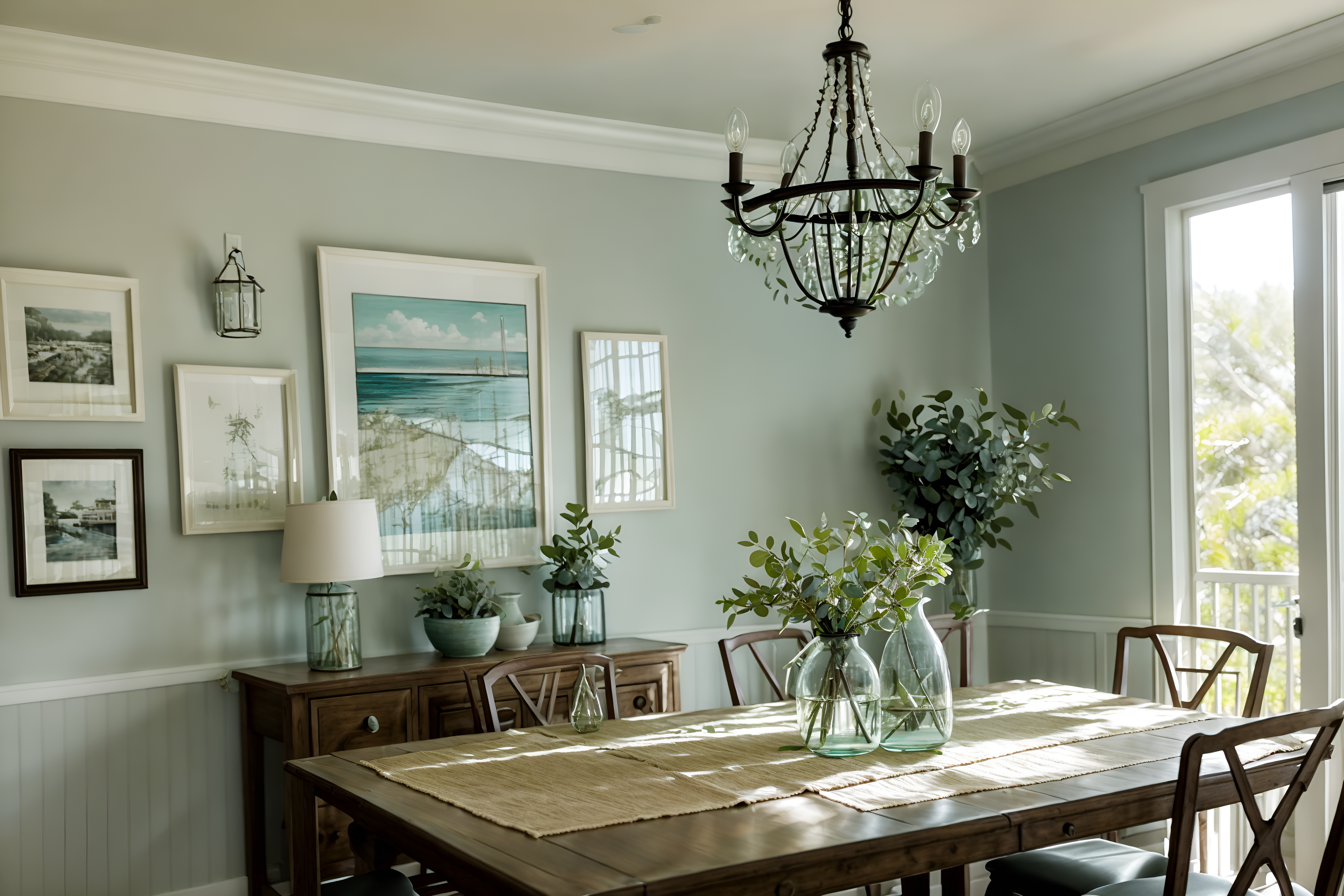 photo from pinterest of coastal-style interior designed (dining room interior) with dining table and painting or photo on wall and vase and table cloth and bookshelves and plant and light or chandelier and plates, cutlery and glasses on dining table. . with . . cinematic photo, highly detailed, cinematic lighting, ultra-detailed, ultrarealistic, photorealism, 8k. trending on pinterest. coastal interior design style. masterpiece, cinematic light, ultrarealistic+, photorealistic+, 8k, raw photo, realistic, sharp focus on eyes, (symmetrical eyes), (intact eyes), hyperrealistic, highest quality, best quality, , highly detailed, masterpiece, best quality, extremely detailed 8k wallpaper, masterpiece, best quality, ultra-detailed, best shadow, detailed background, detailed face, detailed eyes, high contrast, best illumination, detailed face, dulux, caustic, dynamic angle, detailed glow. dramatic lighting. highly detailed, insanely detailed hair, symmetrical, intricate details, professionally retouched, 8k high definition. strong bokeh. award winning photo.