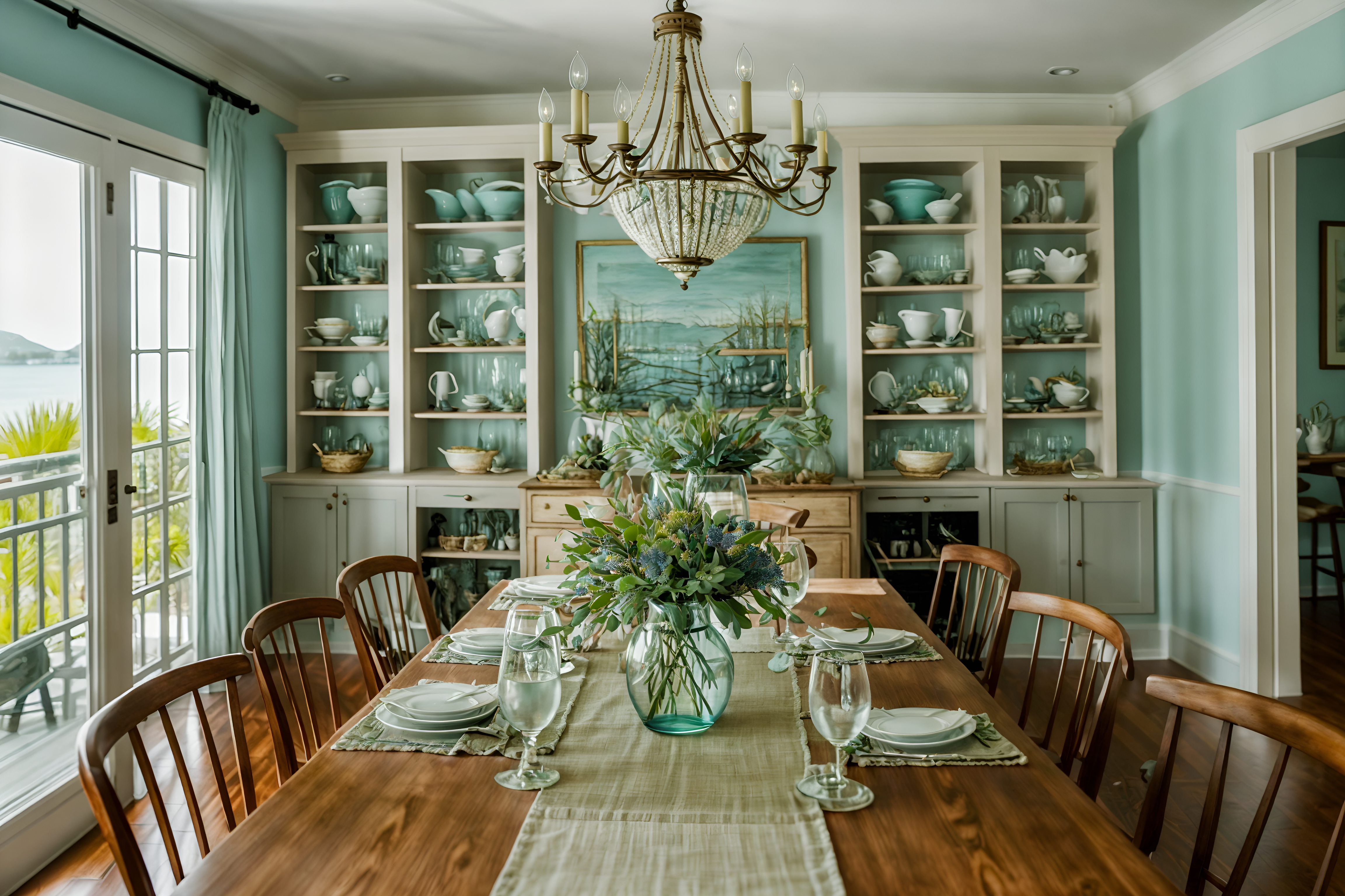 photo from pinterest of coastal-style interior designed (dining room interior) with dining table and painting or photo on wall and vase and table cloth and bookshelves and plant and light or chandelier and plates, cutlery and glasses on dining table. . with . . cinematic photo, highly detailed, cinematic lighting, ultra-detailed, ultrarealistic, photorealism, 8k. trending on pinterest. coastal interior design style. masterpiece, cinematic light, ultrarealistic+, photorealistic+, 8k, raw photo, realistic, sharp focus on eyes, (symmetrical eyes), (intact eyes), hyperrealistic, highest quality, best quality, , highly detailed, masterpiece, best quality, extremely detailed 8k wallpaper, masterpiece, best quality, ultra-detailed, best shadow, detailed background, detailed face, detailed eyes, high contrast, best illumination, detailed face, dulux, caustic, dynamic angle, detailed glow. dramatic lighting. highly detailed, insanely detailed hair, symmetrical, intricate details, professionally retouched, 8k high definition. strong bokeh. award winning photo.