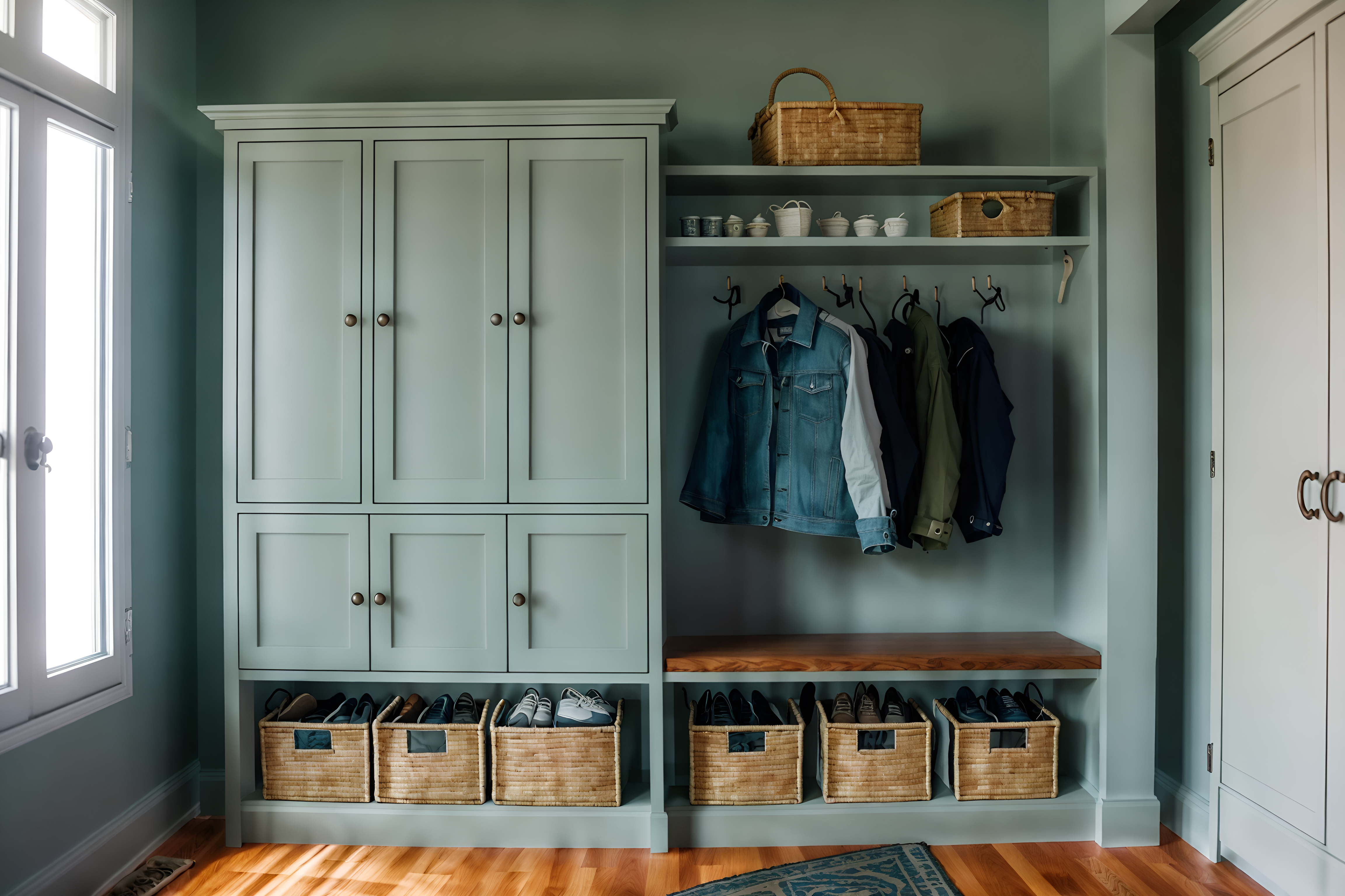 photo from pinterest of coastal-style interior designed (drop zone interior) with storage baskets and cabinets and shelves for shoes and wall hooks for coats and storage drawers and high up storage and a bench and lockers. . with . . cinematic photo, highly detailed, cinematic lighting, ultra-detailed, ultrarealistic, photorealism, 8k. trending on pinterest. coastal interior design style. masterpiece, cinematic light, ultrarealistic+, photorealistic+, 8k, raw photo, realistic, sharp focus on eyes, (symmetrical eyes), (intact eyes), hyperrealistic, highest quality, best quality, , highly detailed, masterpiece, best quality, extremely detailed 8k wallpaper, masterpiece, best quality, ultra-detailed, best shadow, detailed background, detailed face, detailed eyes, high contrast, best illumination, detailed face, dulux, caustic, dynamic angle, detailed glow. dramatic lighting. highly detailed, insanely detailed hair, symmetrical, intricate details, professionally retouched, 8k high definition. strong bokeh. award winning photo.