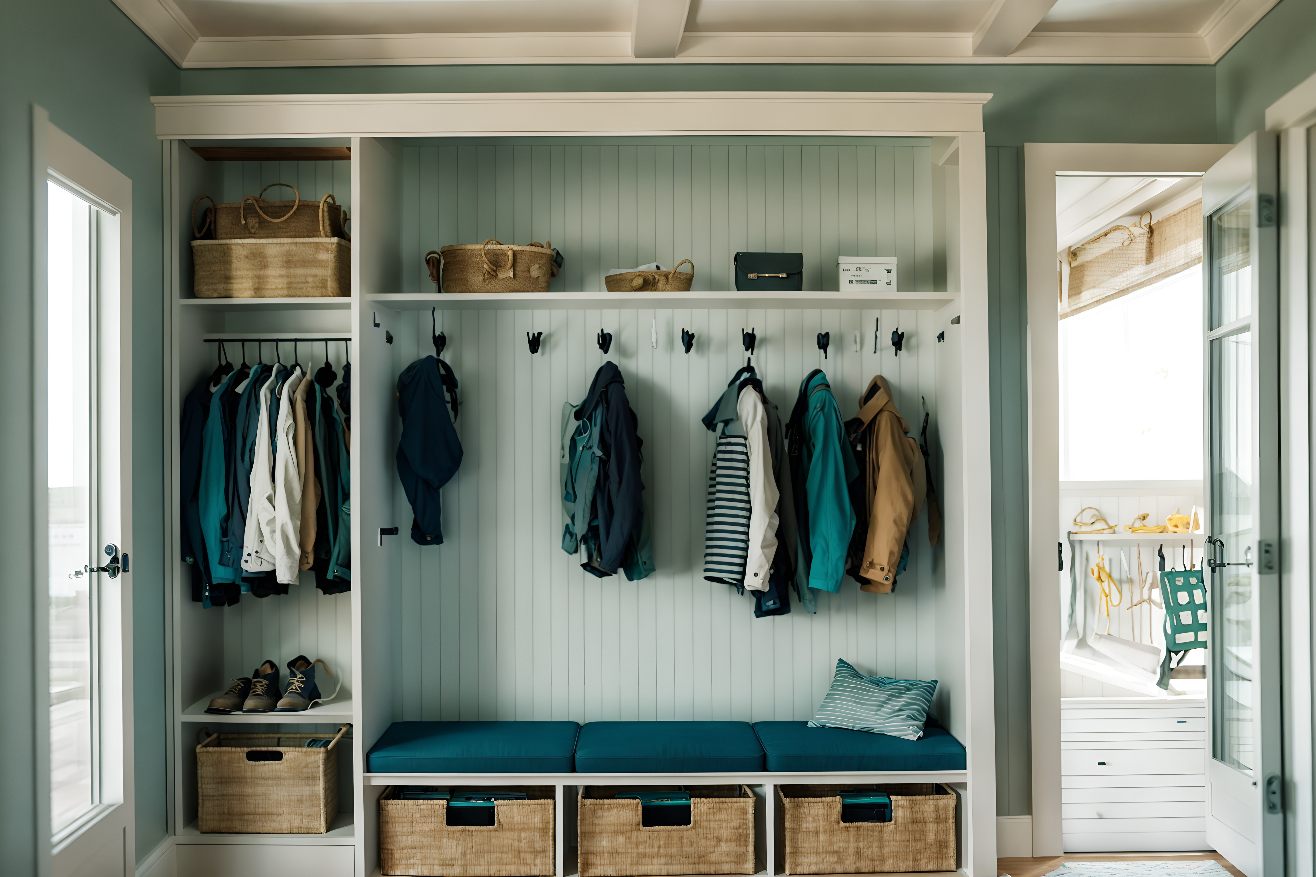 photo from pinterest of coastal-style interior designed (drop zone interior) with storage baskets and cabinets and shelves for shoes and wall hooks for coats and storage drawers and high up storage and a bench and lockers. . with . . cinematic photo, highly detailed, cinematic lighting, ultra-detailed, ultrarealistic, photorealism, 8k. trending on pinterest. coastal interior design style. masterpiece, cinematic light, ultrarealistic+, photorealistic+, 8k, raw photo, realistic, sharp focus on eyes, (symmetrical eyes), (intact eyes), hyperrealistic, highest quality, best quality, , highly detailed, masterpiece, best quality, extremely detailed 8k wallpaper, masterpiece, best quality, ultra-detailed, best shadow, detailed background, detailed face, detailed eyes, high contrast, best illumination, detailed face, dulux, caustic, dynamic angle, detailed glow. dramatic lighting. highly detailed, insanely detailed hair, symmetrical, intricate details, professionally retouched, 8k high definition. strong bokeh. award winning photo.
