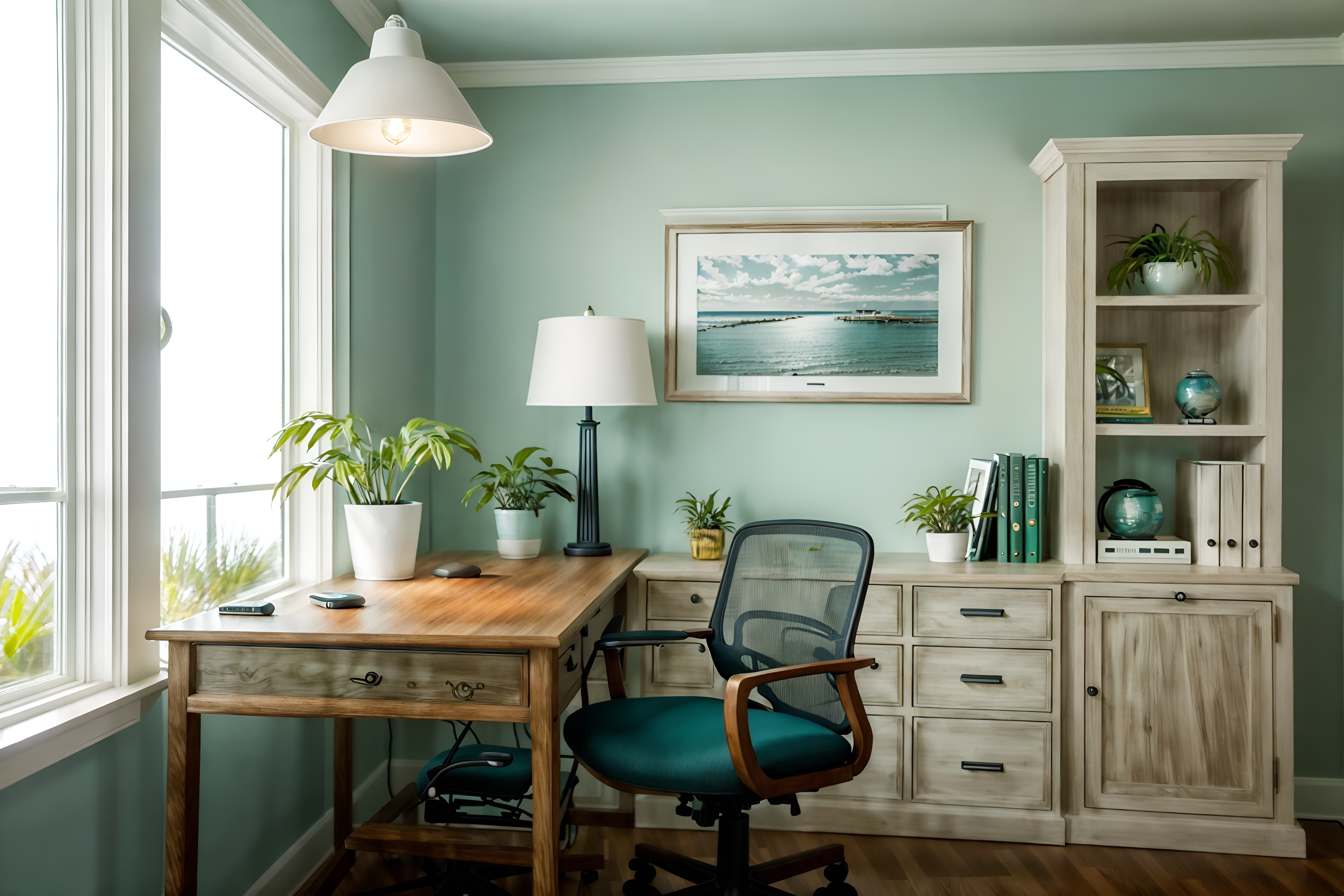 photo from pinterest of coastal-style interior designed (home office interior) with cabinets and desk lamp and plant and office chair and computer desk and cabinets. . with . . cinematic photo, highly detailed, cinematic lighting, ultra-detailed, ultrarealistic, photorealism, 8k. trending on pinterest. coastal interior design style. masterpiece, cinematic light, ultrarealistic+, photorealistic+, 8k, raw photo, realistic, sharp focus on eyes, (symmetrical eyes), (intact eyes), hyperrealistic, highest quality, best quality, , highly detailed, masterpiece, best quality, extremely detailed 8k wallpaper, masterpiece, best quality, ultra-detailed, best shadow, detailed background, detailed face, detailed eyes, high contrast, best illumination, detailed face, dulux, caustic, dynamic angle, detailed glow. dramatic lighting. highly detailed, insanely detailed hair, symmetrical, intricate details, professionally retouched, 8k high definition. strong bokeh. award winning photo.