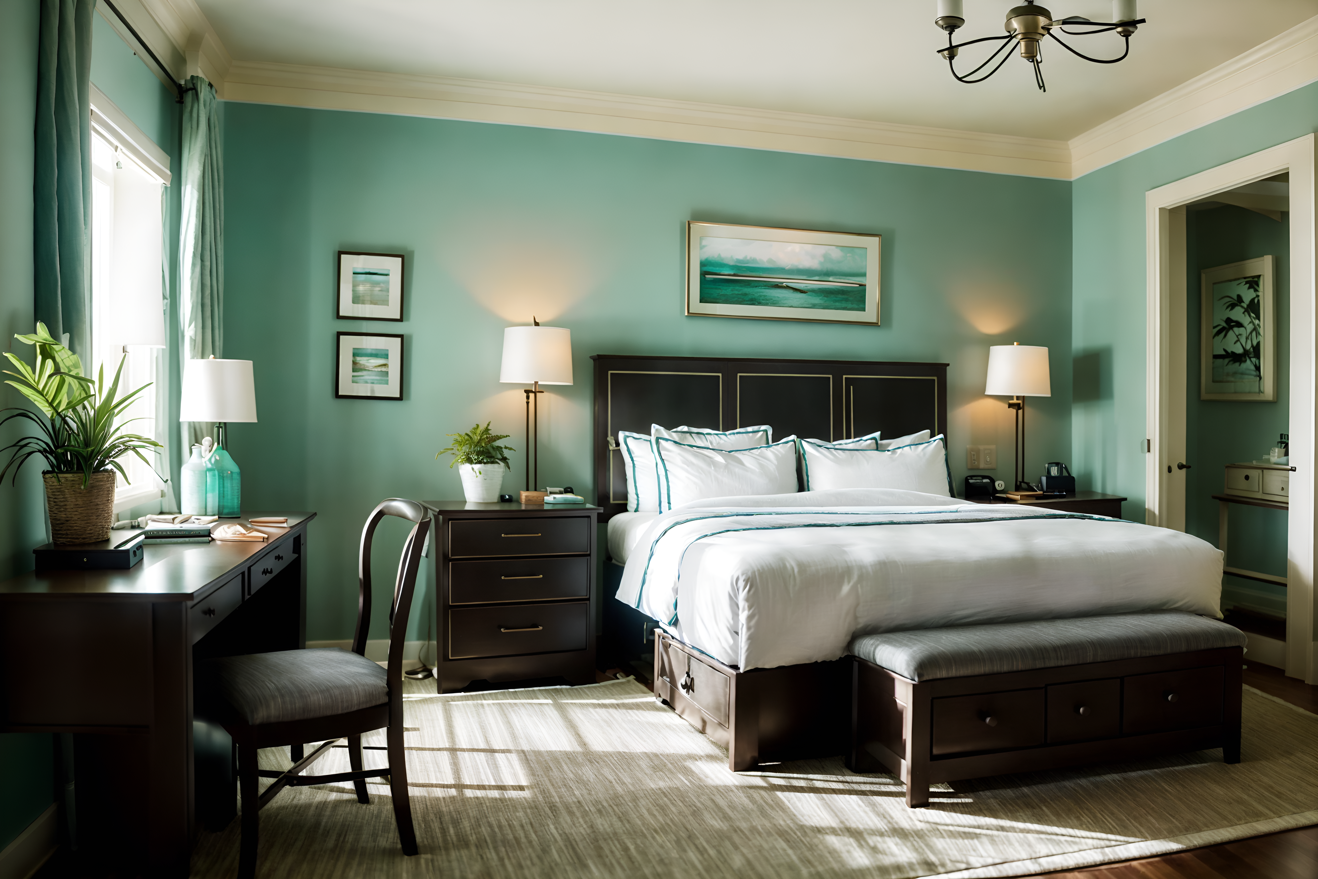 photo from pinterest of coastal-style interior designed (hotel room interior) with hotel bathroom and working desk with desk chair and bed and plant and accent chair and dresser closet and storage bench or ottoman and night light. . with . . cinematic photo, highly detailed, cinematic lighting, ultra-detailed, ultrarealistic, photorealism, 8k. trending on pinterest. coastal interior design style. masterpiece, cinematic light, ultrarealistic+, photorealistic+, 8k, raw photo, realistic, sharp focus on eyes, (symmetrical eyes), (intact eyes), hyperrealistic, highest quality, best quality, , highly detailed, masterpiece, best quality, extremely detailed 8k wallpaper, masterpiece, best quality, ultra-detailed, best shadow, detailed background, detailed face, detailed eyes, high contrast, best illumination, detailed face, dulux, caustic, dynamic angle, detailed glow. dramatic lighting. highly detailed, insanely detailed hair, symmetrical, intricate details, professionally retouched, 8k high definition. strong bokeh. award winning photo.