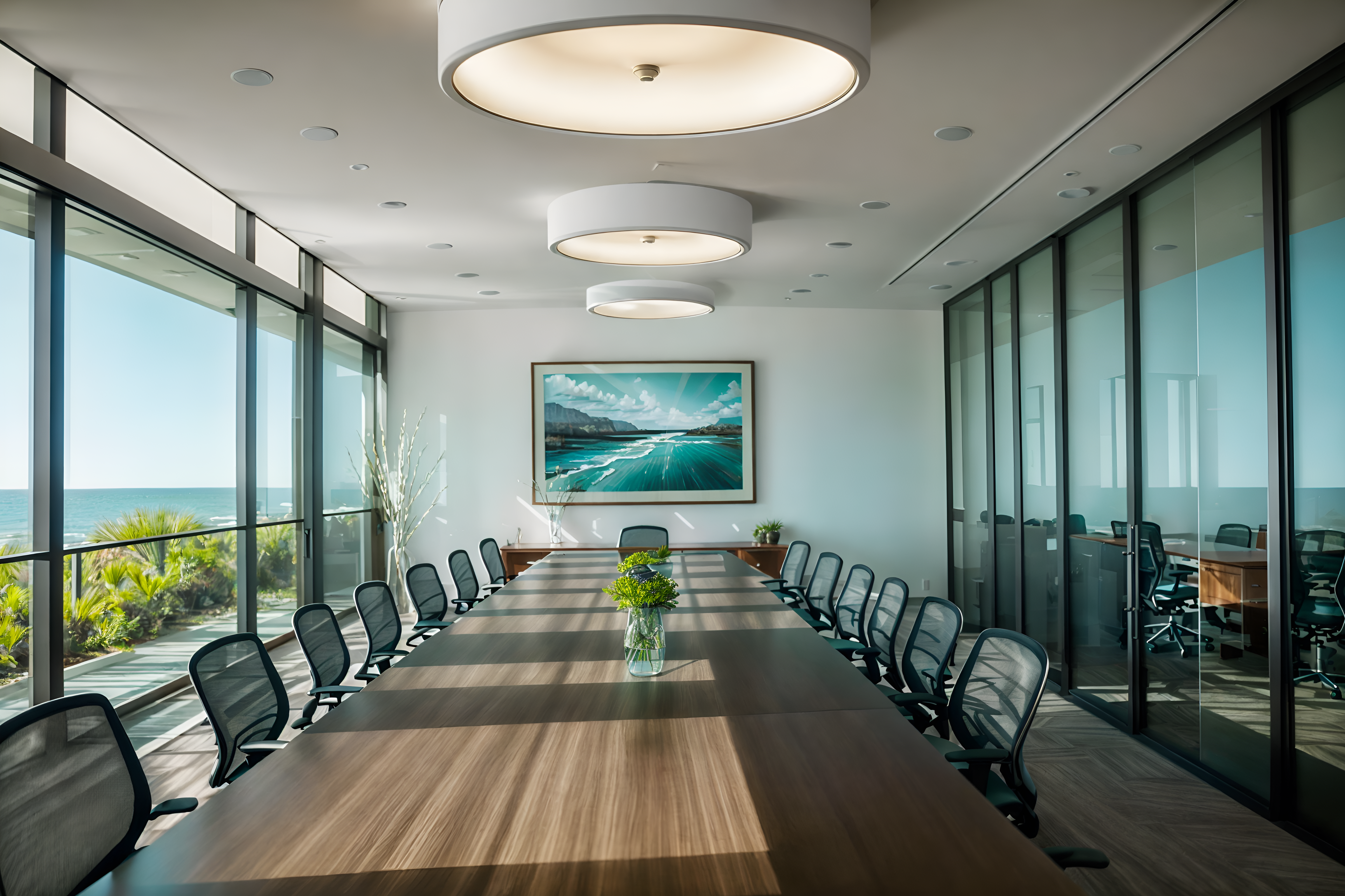 photo from pinterest of coastal-style interior designed (meeting room interior) with office chairs and glass doors and painting or photo on wall and boardroom table and glass walls and plant and vase and cabinets. . with . . cinematic photo, highly detailed, cinematic lighting, ultra-detailed, ultrarealistic, photorealism, 8k. trending on pinterest. coastal interior design style. masterpiece, cinematic light, ultrarealistic+, photorealistic+, 8k, raw photo, realistic, sharp focus on eyes, (symmetrical eyes), (intact eyes), hyperrealistic, highest quality, best quality, , highly detailed, masterpiece, best quality, extremely detailed 8k wallpaper, masterpiece, best quality, ultra-detailed, best shadow, detailed background, detailed face, detailed eyes, high contrast, best illumination, detailed face, dulux, caustic, dynamic angle, detailed glow. dramatic lighting. highly detailed, insanely detailed hair, symmetrical, intricate details, professionally retouched, 8k high definition. strong bokeh. award winning photo.