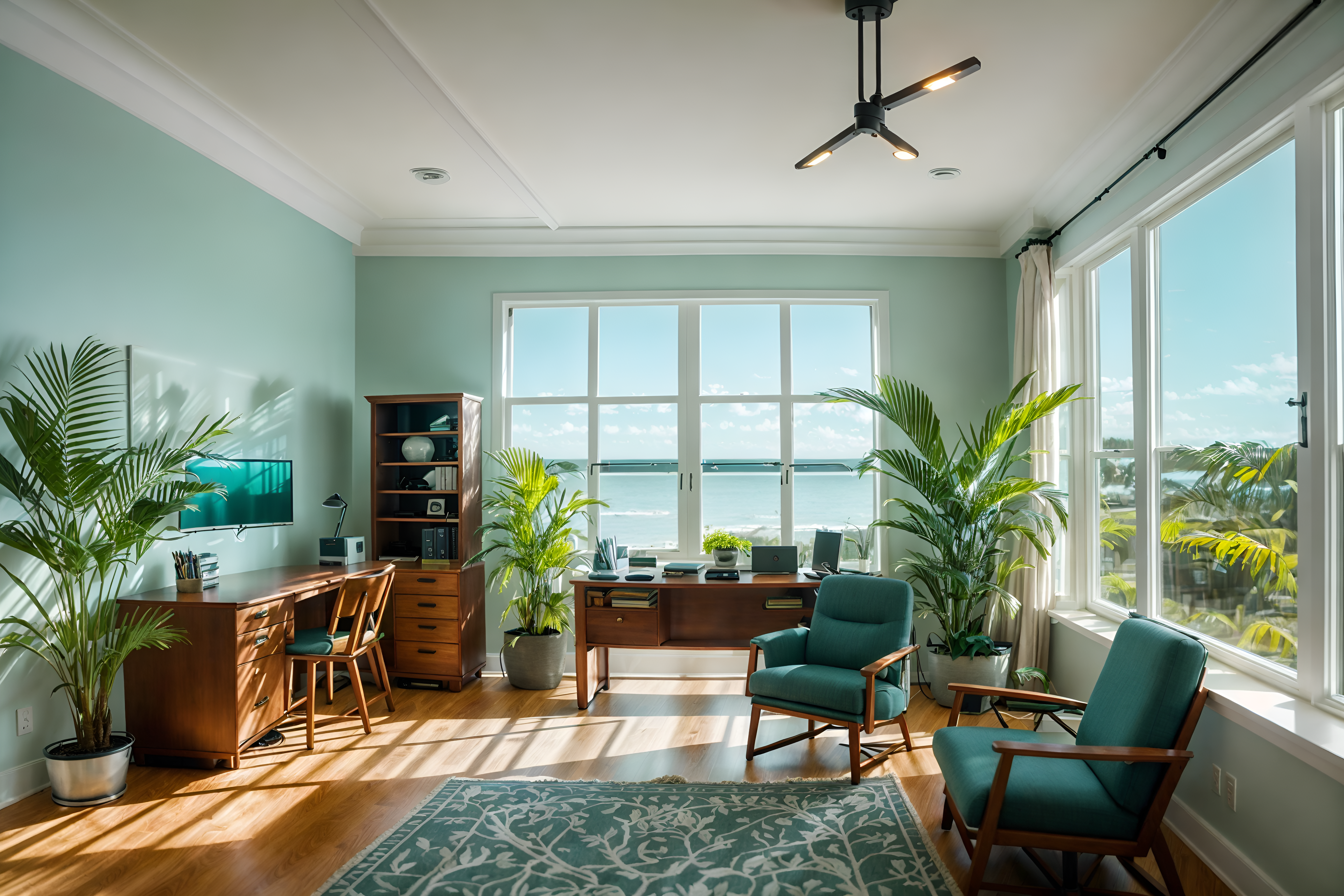 photo from pinterest of coastal-style interior designed (office interior) with cabinets and lounge chairs and plants and desk lamps and seating area with sofa and office desks and computer desks and windows. . with . . cinematic photo, highly detailed, cinematic lighting, ultra-detailed, ultrarealistic, photorealism, 8k. trending on pinterest. coastal interior design style. masterpiece, cinematic light, ultrarealistic+, photorealistic+, 8k, raw photo, realistic, sharp focus on eyes, (symmetrical eyes), (intact eyes), hyperrealistic, highest quality, best quality, , highly detailed, masterpiece, best quality, extremely detailed 8k wallpaper, masterpiece, best quality, ultra-detailed, best shadow, detailed background, detailed face, detailed eyes, high contrast, best illumination, detailed face, dulux, caustic, dynamic angle, detailed glow. dramatic lighting. highly detailed, insanely detailed hair, symmetrical, intricate details, professionally retouched, 8k high definition. strong bokeh. award winning photo.