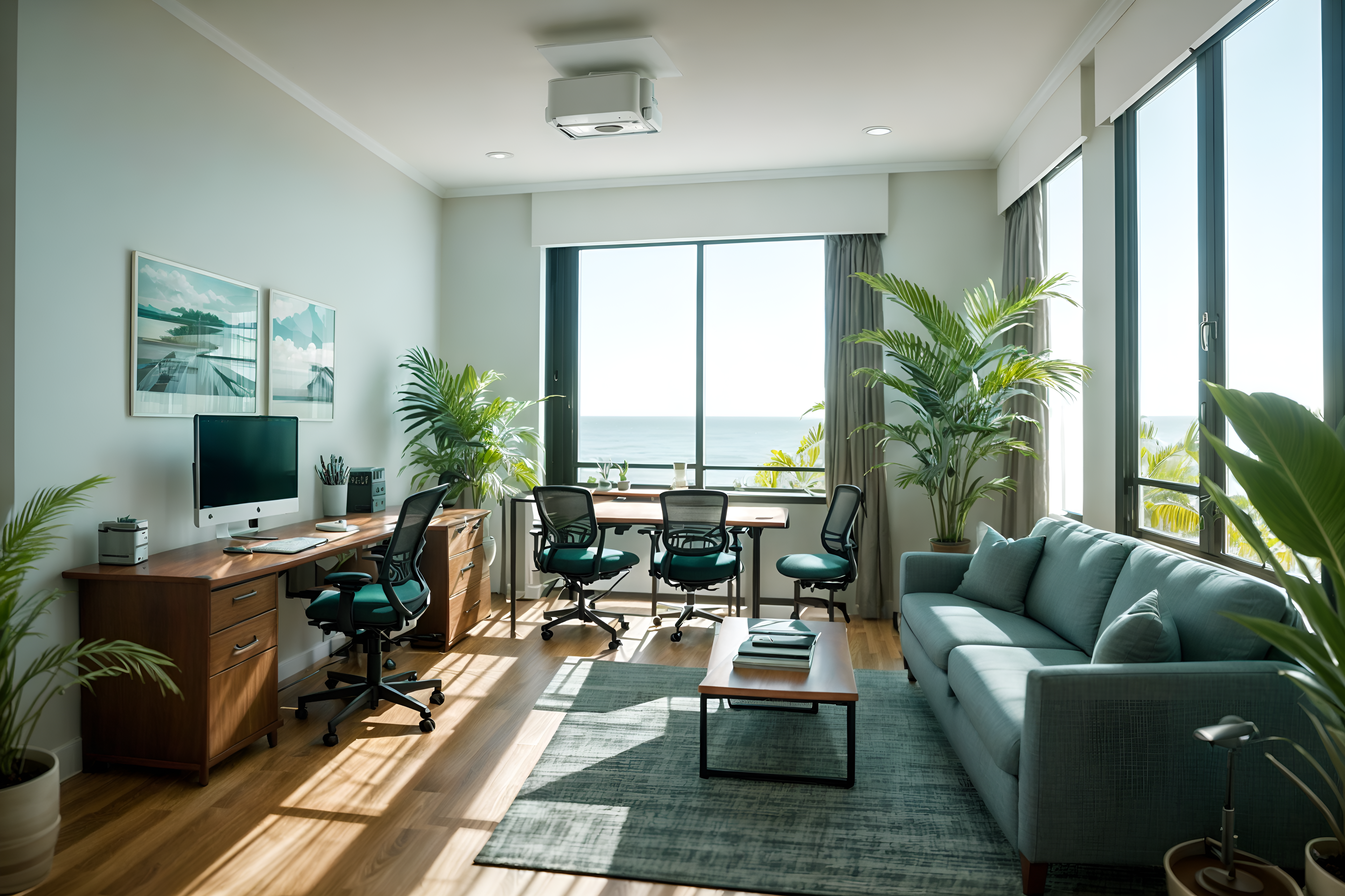 photo from pinterest of coastal-style interior designed (office interior) with cabinets and office desks and desk lamps and computer desks and office chairs and windows and seating area with sofa and plants. . with . . cinematic photo, highly detailed, cinematic lighting, ultra-detailed, ultrarealistic, photorealism, 8k. trending on pinterest. coastal interior design style. masterpiece, cinematic light, ultrarealistic+, photorealistic+, 8k, raw photo, realistic, sharp focus on eyes, (symmetrical eyes), (intact eyes), hyperrealistic, highest quality, best quality, , highly detailed, masterpiece, best quality, extremely detailed 8k wallpaper, masterpiece, best quality, ultra-detailed, best shadow, detailed background, detailed face, detailed eyes, high contrast, best illumination, detailed face, dulux, caustic, dynamic angle, detailed glow. dramatic lighting. highly detailed, insanely detailed hair, symmetrical, intricate details, professionally retouched, 8k high definition. strong bokeh. award winning photo.