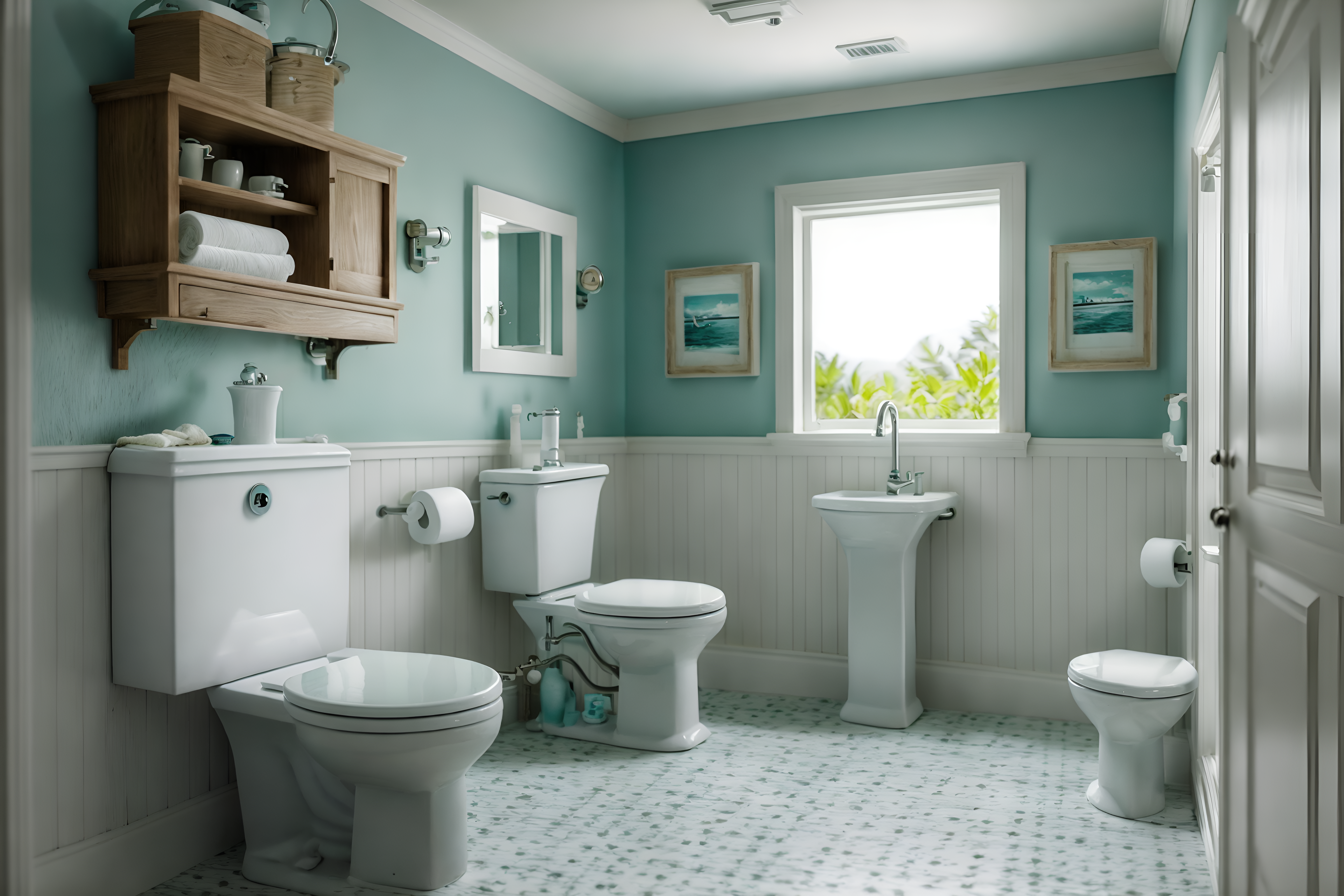 coastal toiletsinterior decorate this toilet with coastal style. . . with toilet paper hanger and toilet with toilet seat up and sink with tap and toilet paper hanger. . with nautical decor and ocean-inspired and beach vibes and relaxed style and sand tones and seaside colors and white decor and airy feel. . .