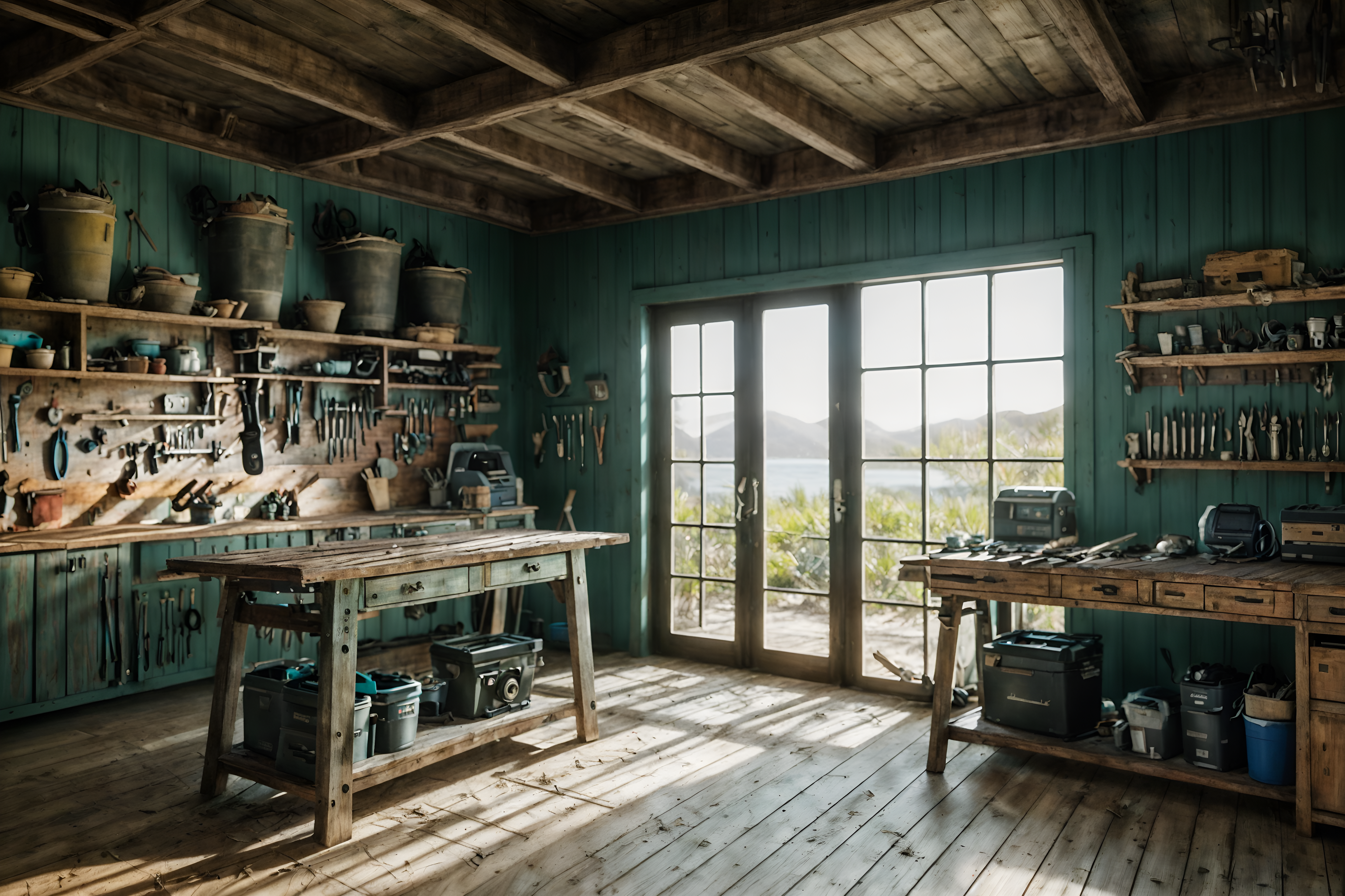 photo from pinterest of coastal-style interior designed (workshop interior) with tool wall and wooden workbench and messy and tool wall. . with . . cinematic photo, highly detailed, cinematic lighting, ultra-detailed, ultrarealistic, photorealism, 8k. trending on pinterest. coastal interior design style. masterpiece, cinematic light, ultrarealistic+, photorealistic+, 8k, raw photo, realistic, sharp focus on eyes, (symmetrical eyes), (intact eyes), hyperrealistic, highest quality, best quality, , highly detailed, masterpiece, best quality, extremely detailed 8k wallpaper, masterpiece, best quality, ultra-detailed, best shadow, detailed background, detailed face, detailed eyes, high contrast, best illumination, detailed face, dulux, caustic, dynamic angle, detailed glow. dramatic lighting. highly detailed, insanely detailed hair, symmetrical, intricate details, professionally retouched, 8k high definition. strong bokeh. award winning photo.