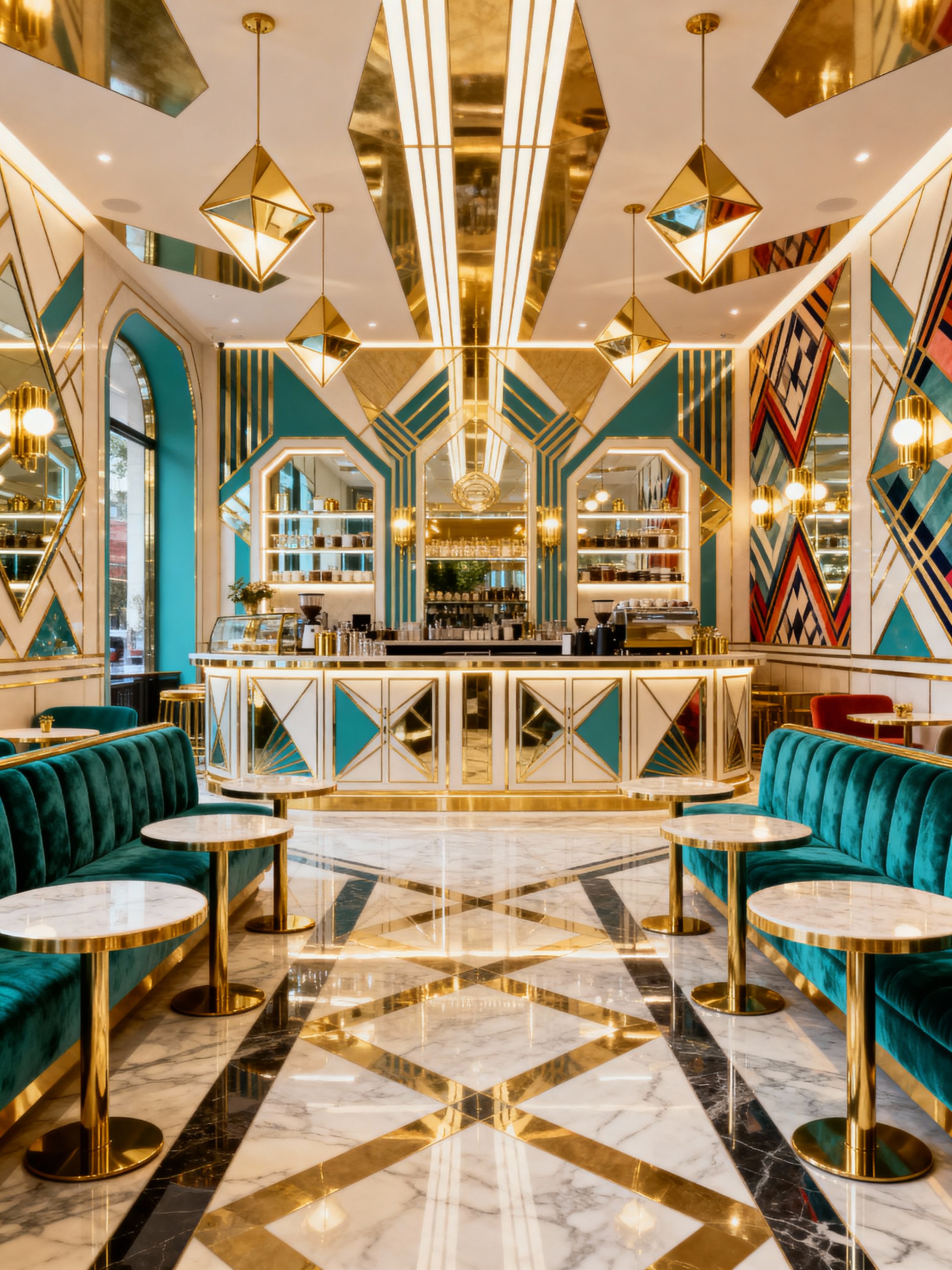 coffee shop with art deco style . with decadent detail and bright and cheerful colors and symmetrical designs and angular shapes and luxury and geometric lines and geometric shapes and stream-lined forms