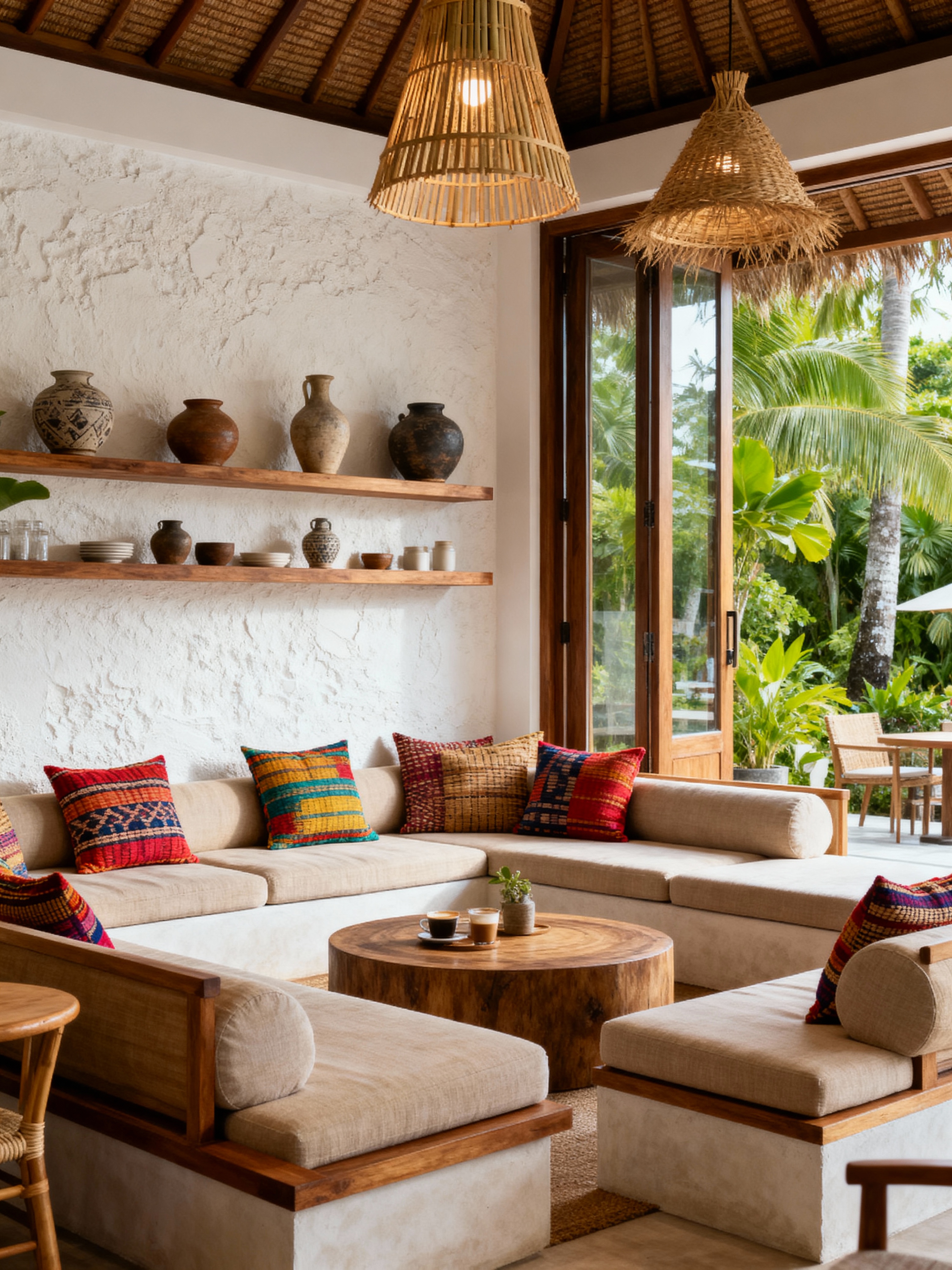 coffee shop with bali style . with handcrafted pottery and vases and low modular sofas and conversation pit with pillows and raffia or bamboo accents and calm, minimal, tropical atmosphere and textured plaster or stucco finish and indoor-outdoor flow with glass doors and white or cream walls
