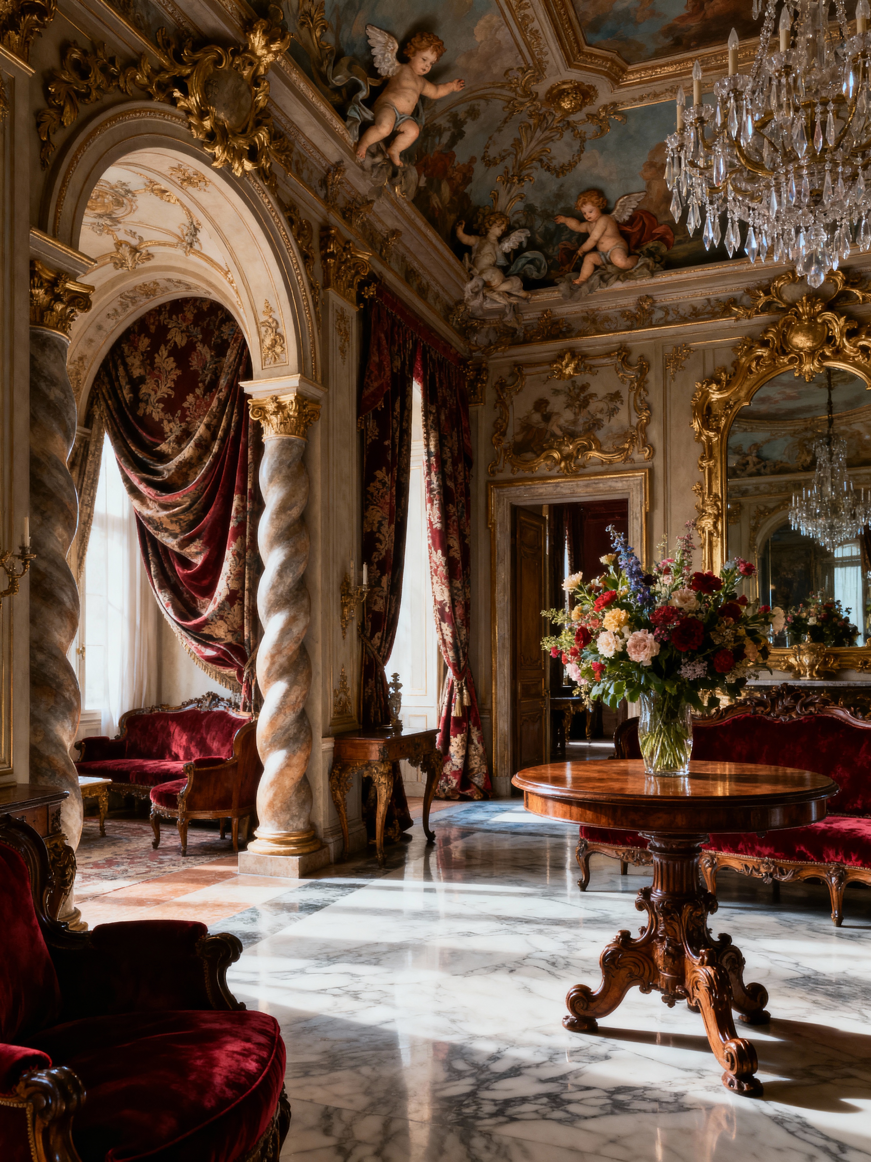 coffee shop with baroque style . with pedestal feet and twisted columns and elaborate ornamentation and drama and sensuous richness and tension and grandeur and movement