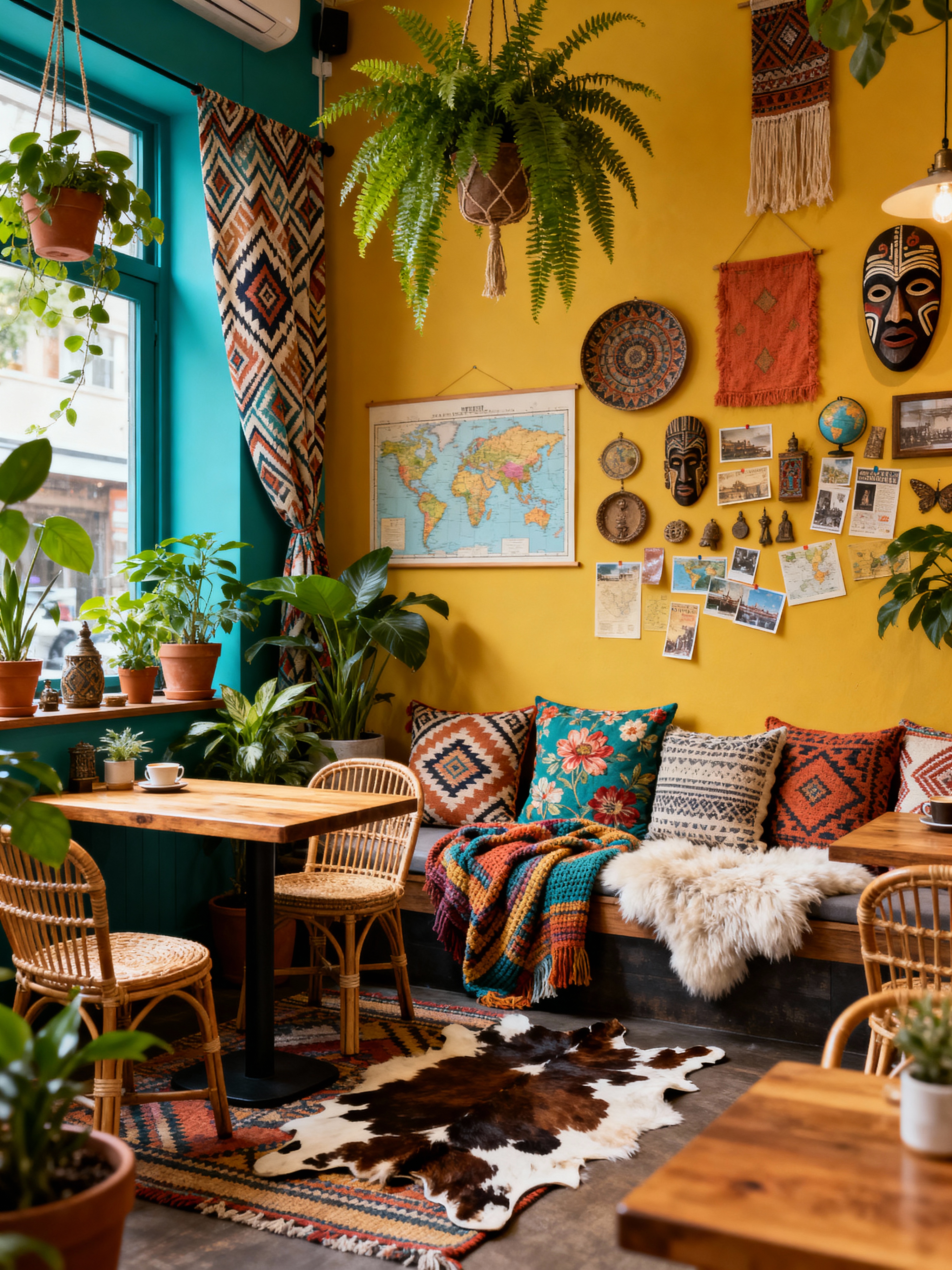 coffee shop with bohemian style . with playful colors and lush green nature and carefree layers of pattern, texture, and color and animal hides and a lack of structure and playful patterns and natural materials and travel trinkets