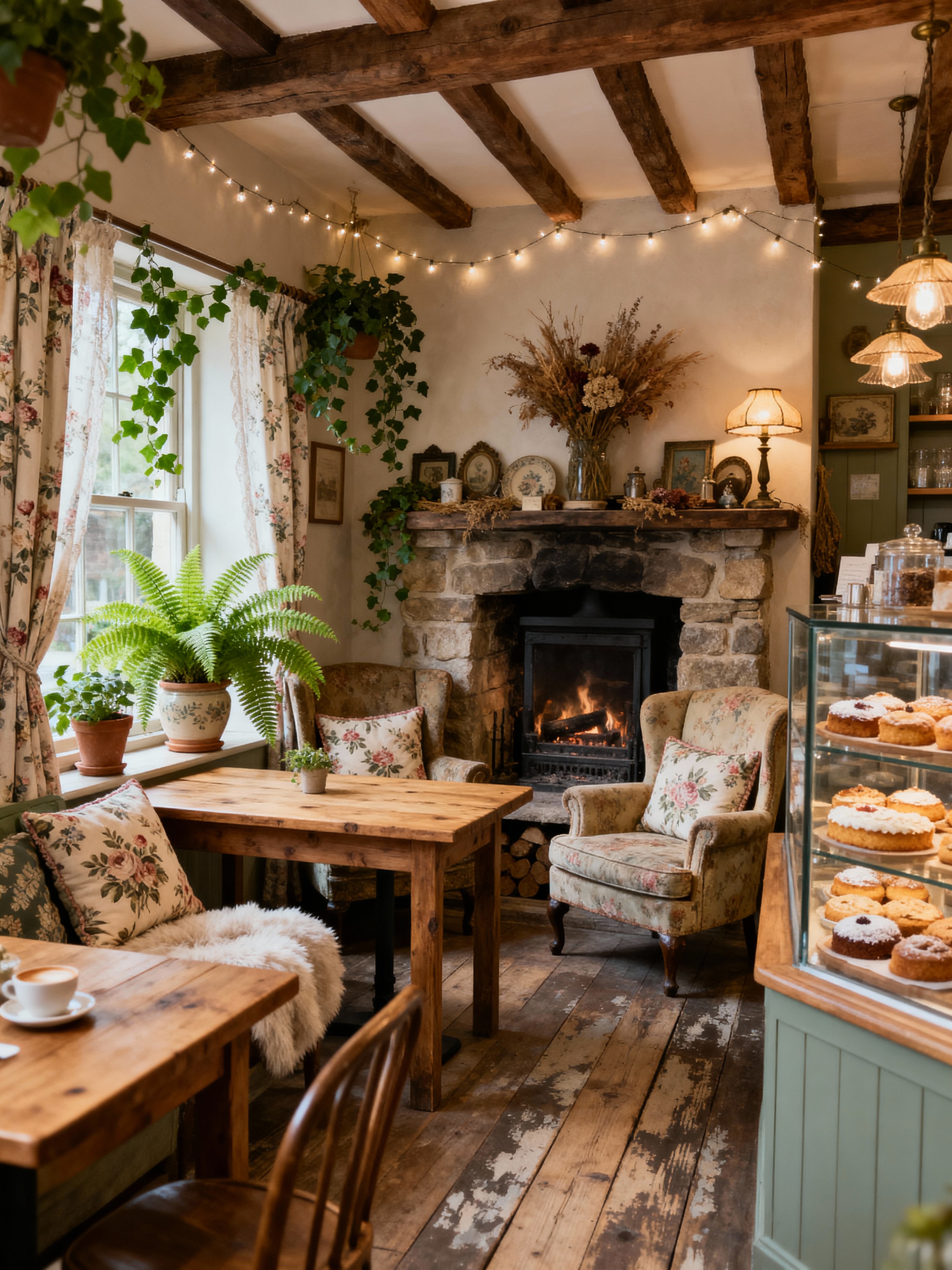 coffee shop with cottagecore style . with natural and traditional and rustic and country style and earthy and cottage style and muted colors and floral patterns