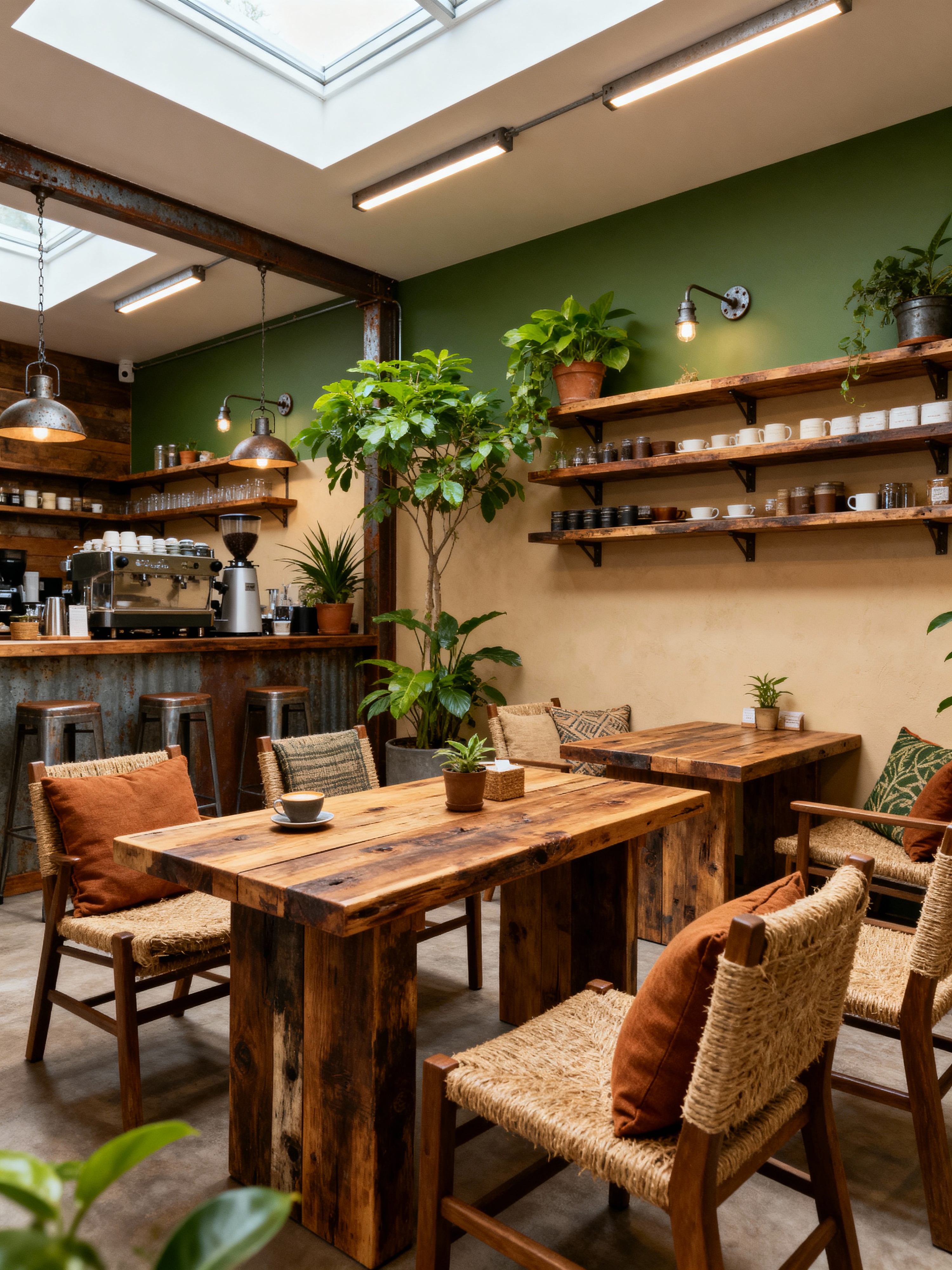coffee shop with eco-friendly style . with non-toxic finishes and renewable resources and reclaimed wood and green living and recycled elements and natural fibers and organic textiles and energy efficient