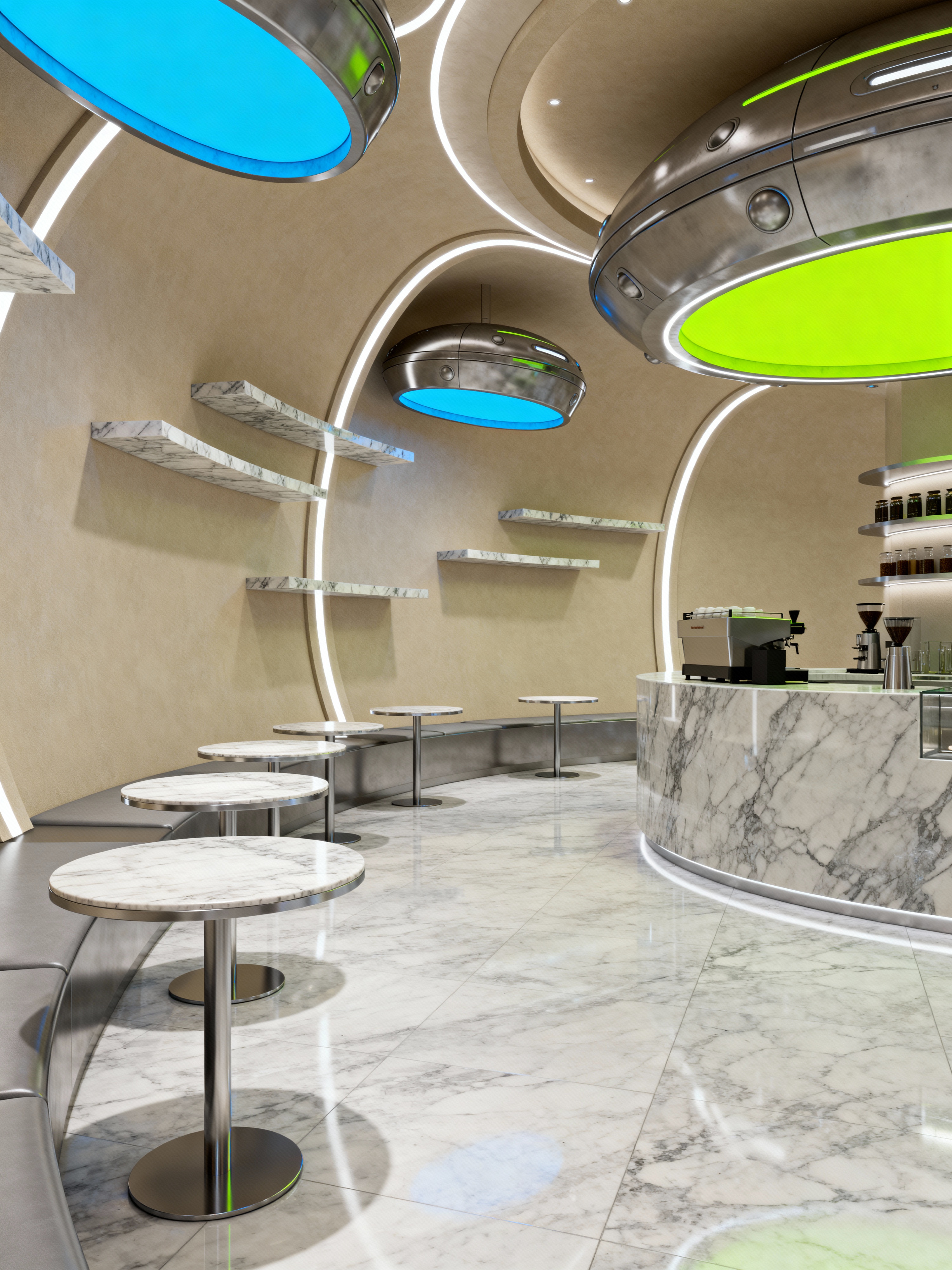 coffee shop with futuristic style . with circular shapes and steel finishing and smooth polished marble and spaceship interior and futuristic interior and floating surfaces and minimalist clean lines and neutral background and bright accents