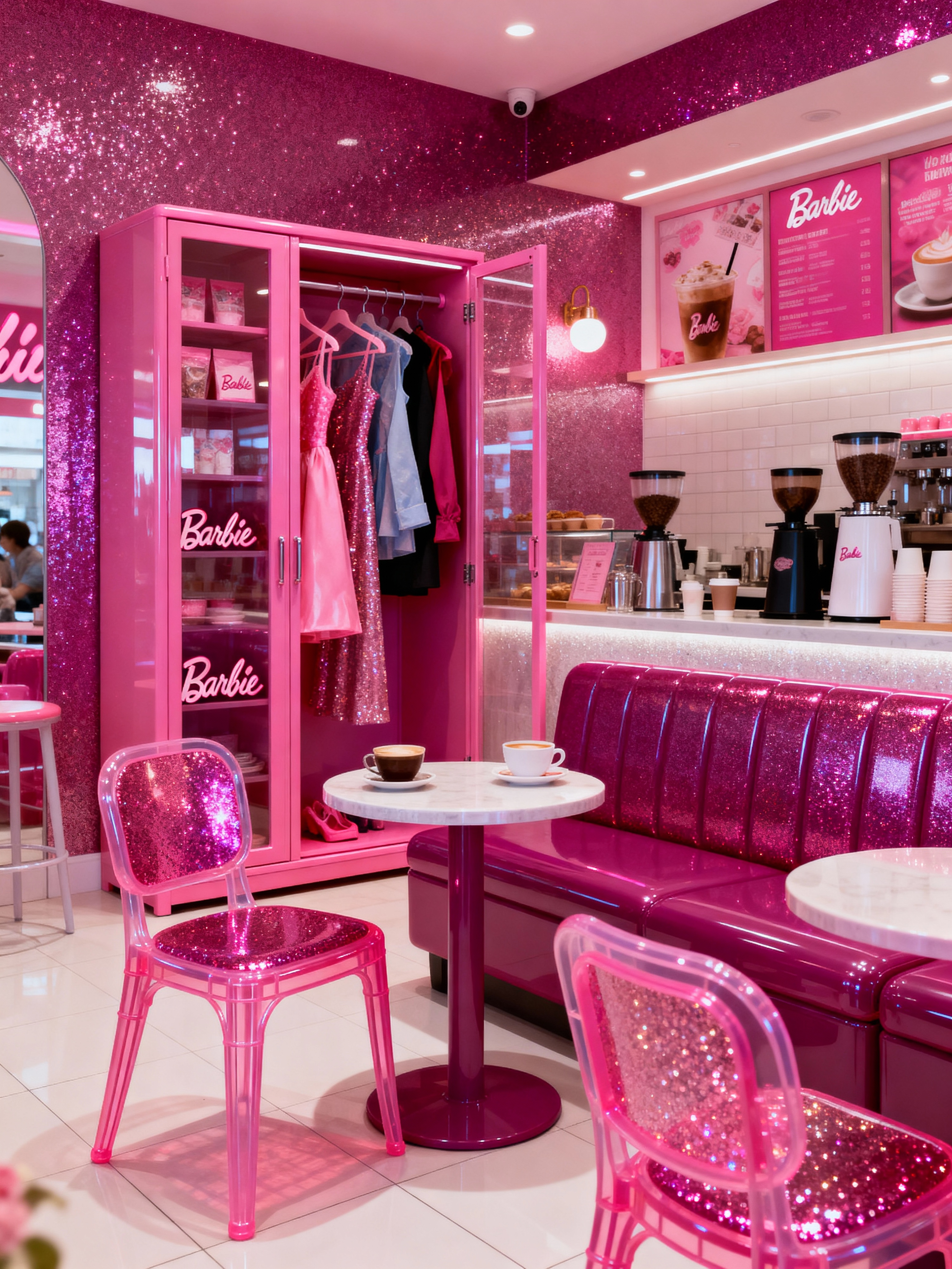 coffee shop with hot pink style . with barbie bold rosy hues like fuchsia and magenta and hot pink barbie colors and barbie chairs and barbie sofa and barbie style interior and barbie glitter and sparkle and barbie closet and barbie plastic interior