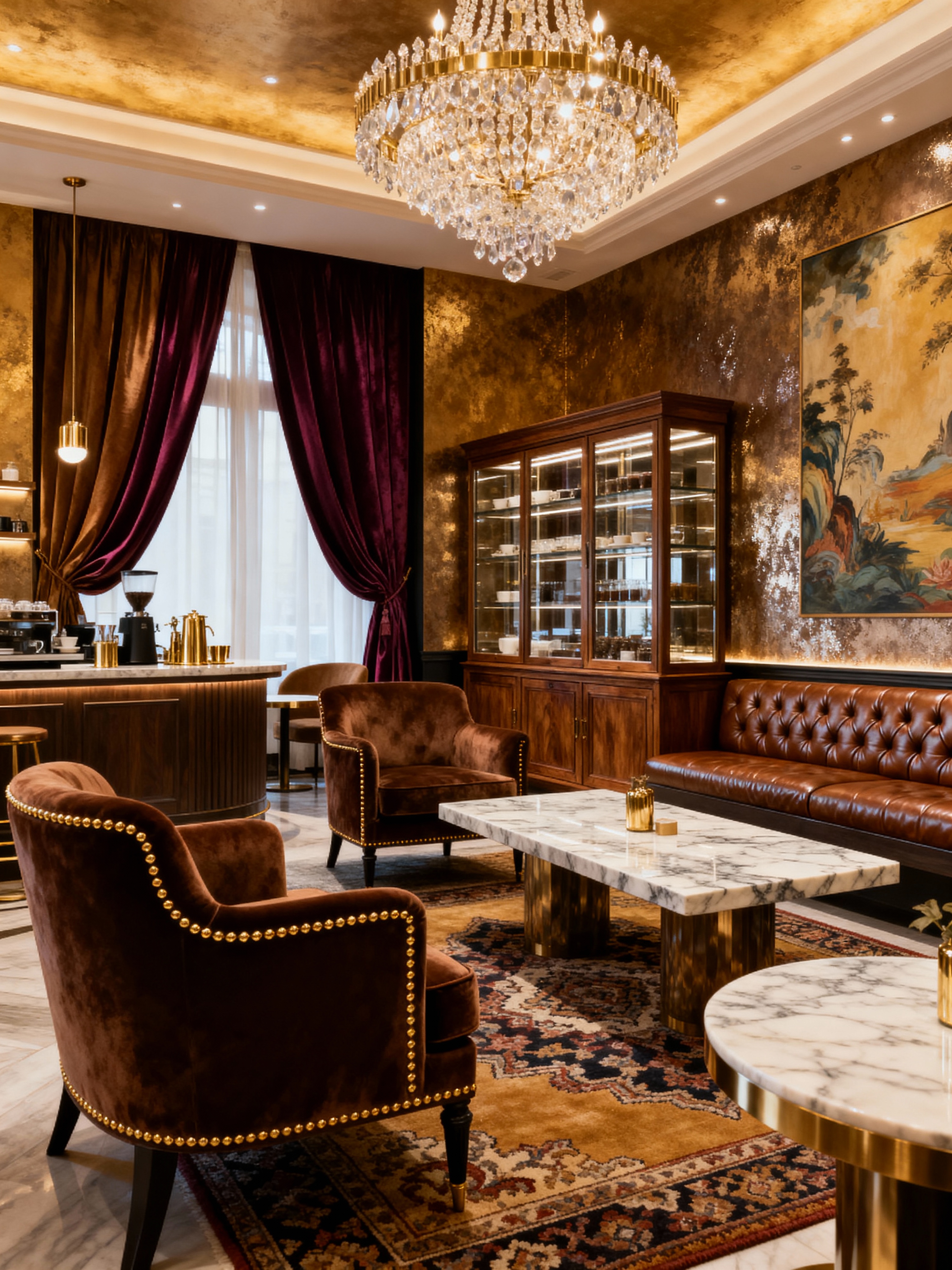 coffee shop with luxury style . with expensive fabrics and exclusive design and lavish comfort and rich textures and sophisticated style and high-end materials and designer furniture and premium finishes