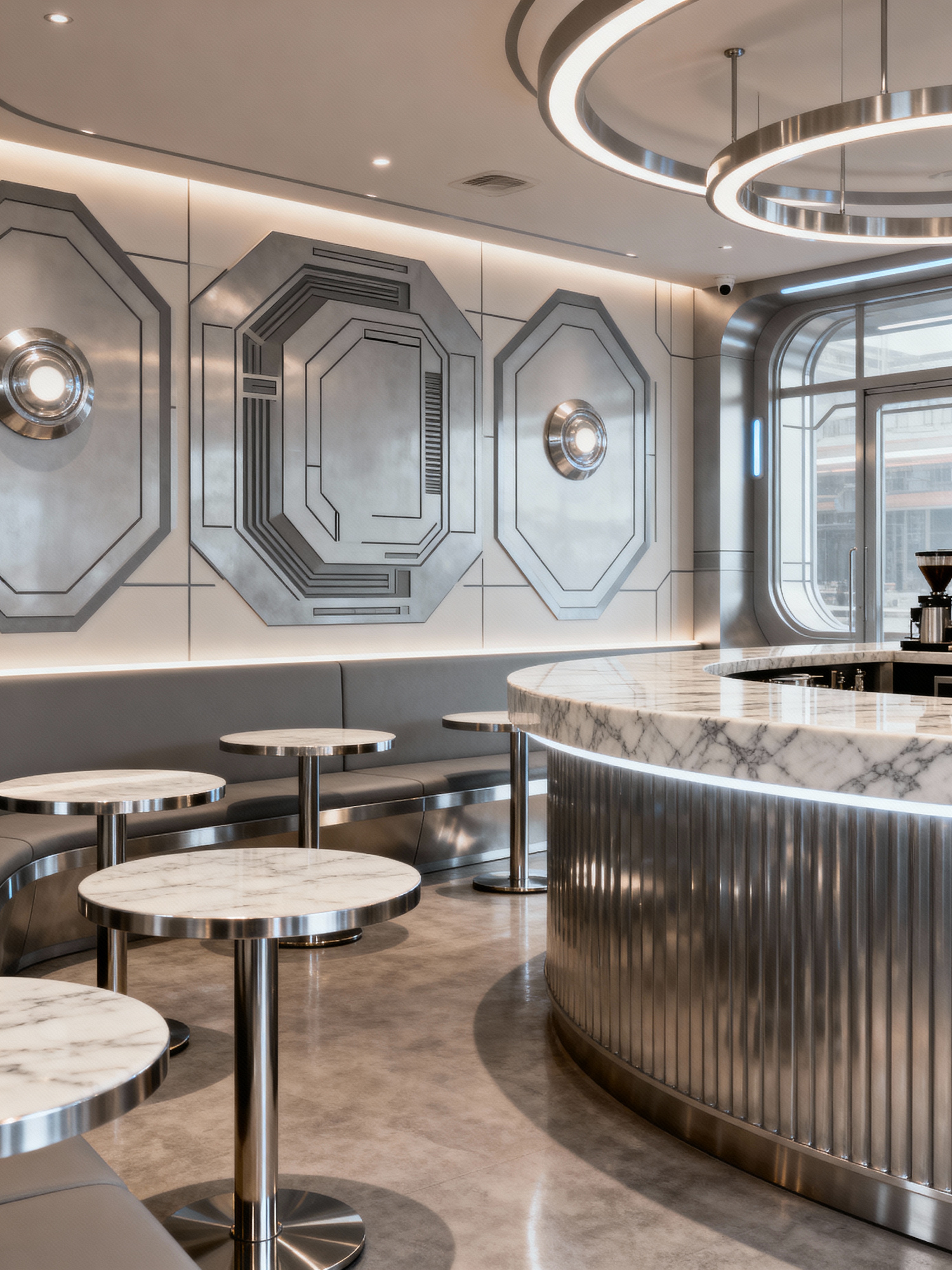 coffee shop with retro futuristic style . with smooth polished marble and strong geometric walls and futurism minimalist interior and minimalist clean lines and circular shapes and steel finishing and smooth marble and vintage futurism