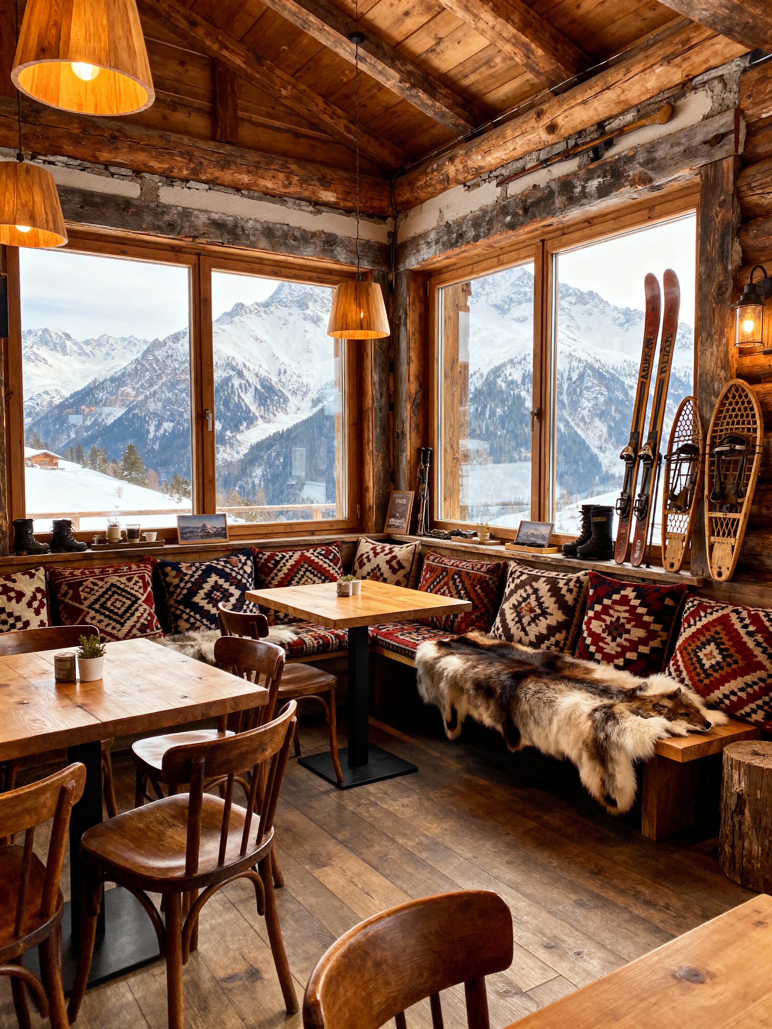 coffee shop with ski chalet style . with exposed timber and rustic and ski-themed decor and window with mountain views and richly patterned fabrics and animal furs and exposed construction beams and wood beams