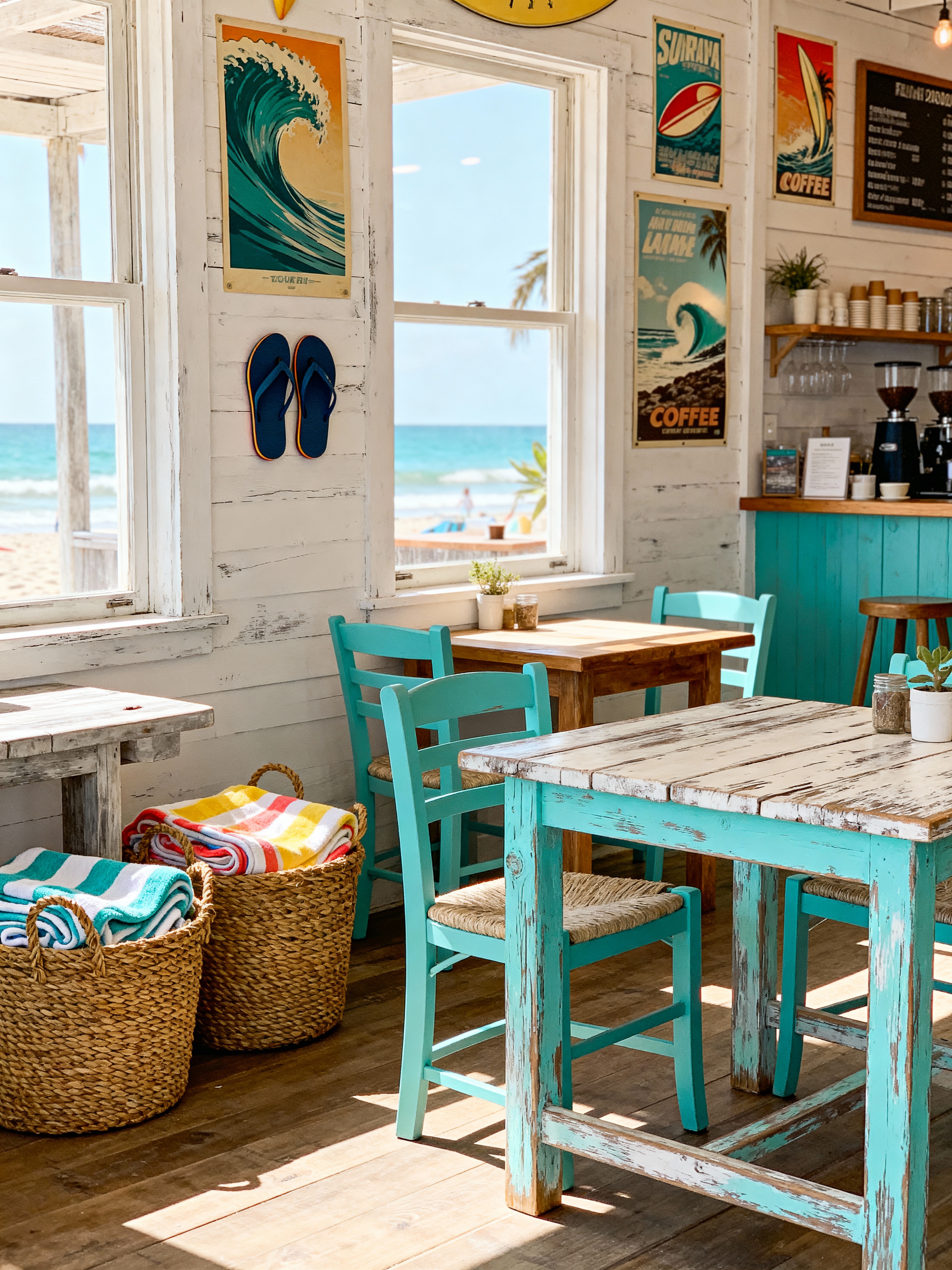 coffee shop with surf shack style . with vintage surf posters and turquoise accents and sun-bleached wood and white-washed walls and woven baskets and beach vibes and relaxed atmosphere and flip-flops