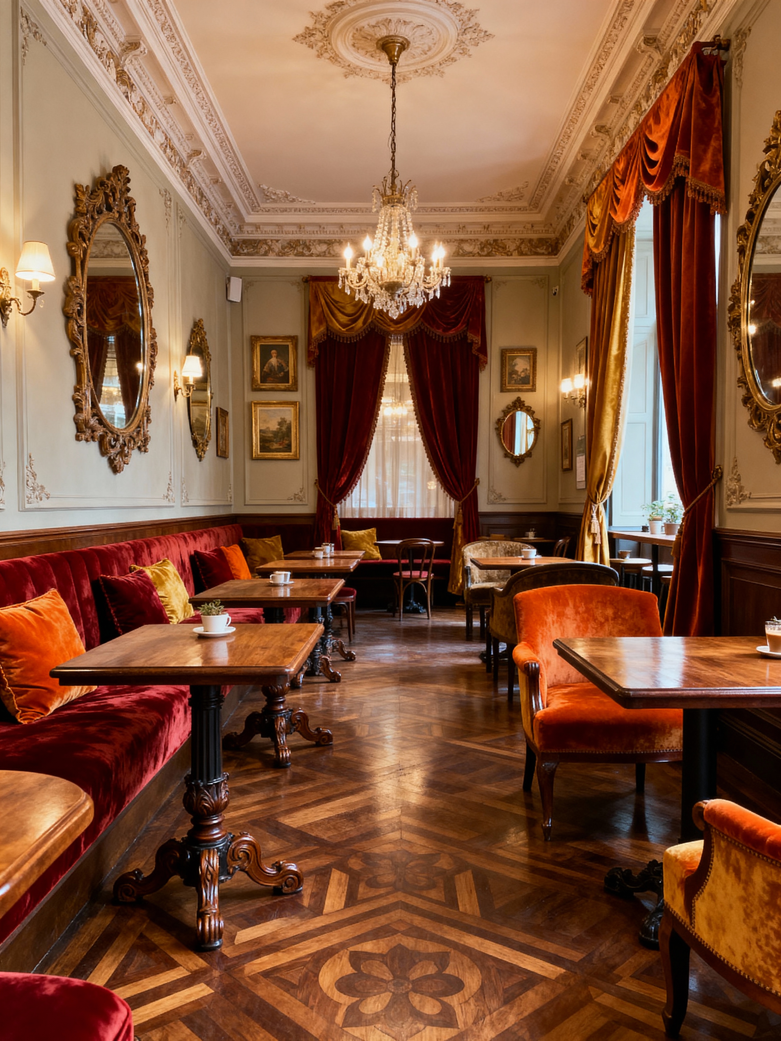 coffee shop with traditional style . with refined atmosphere and crown molding and symmetrical layout and ornate details and antique pieces and luxurious textiles and warm colors and rich fabrics