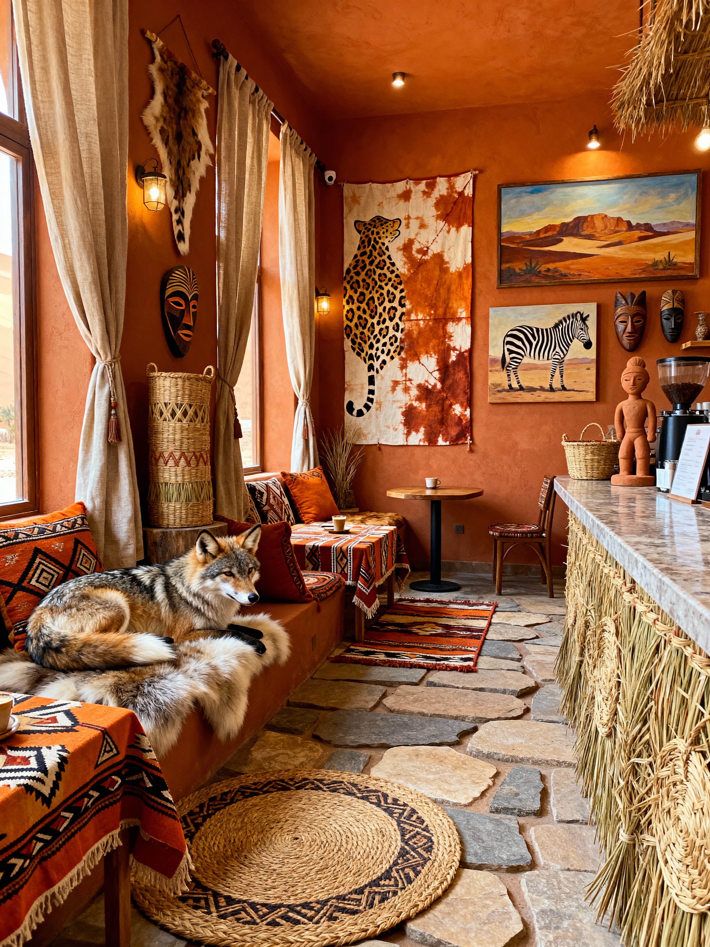 coffee shop with tribal style . with desert colours and animal furslinen and tribal patterns and animal prints and intricate grass weaving and sculptures and artworks and hand dyed batik fabrics and planks of stone