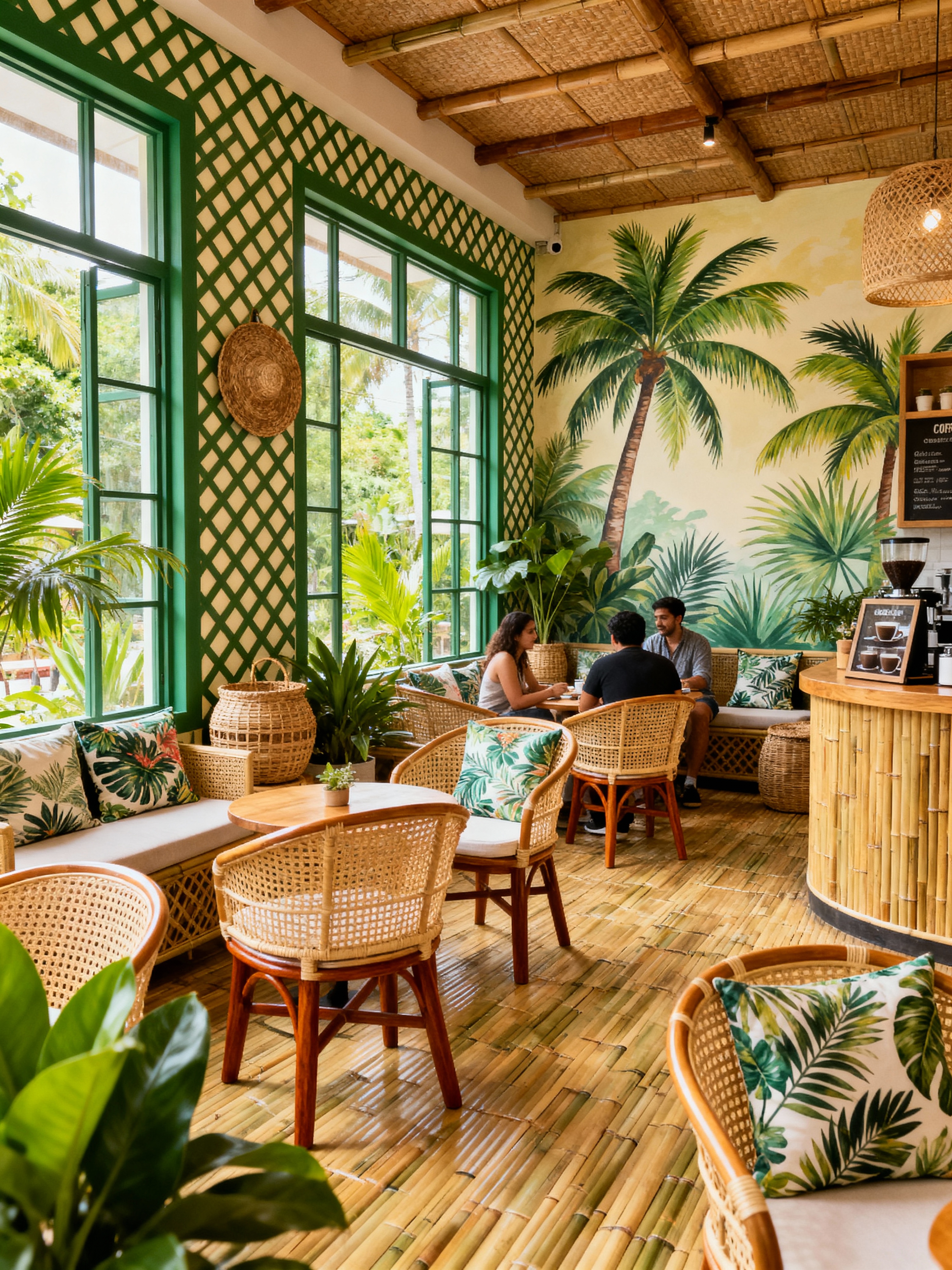 coffee shop with tropical style . with lattice prints and palm leaves and palm trees and cane motifs and wicker and rattan and teak and bamboo