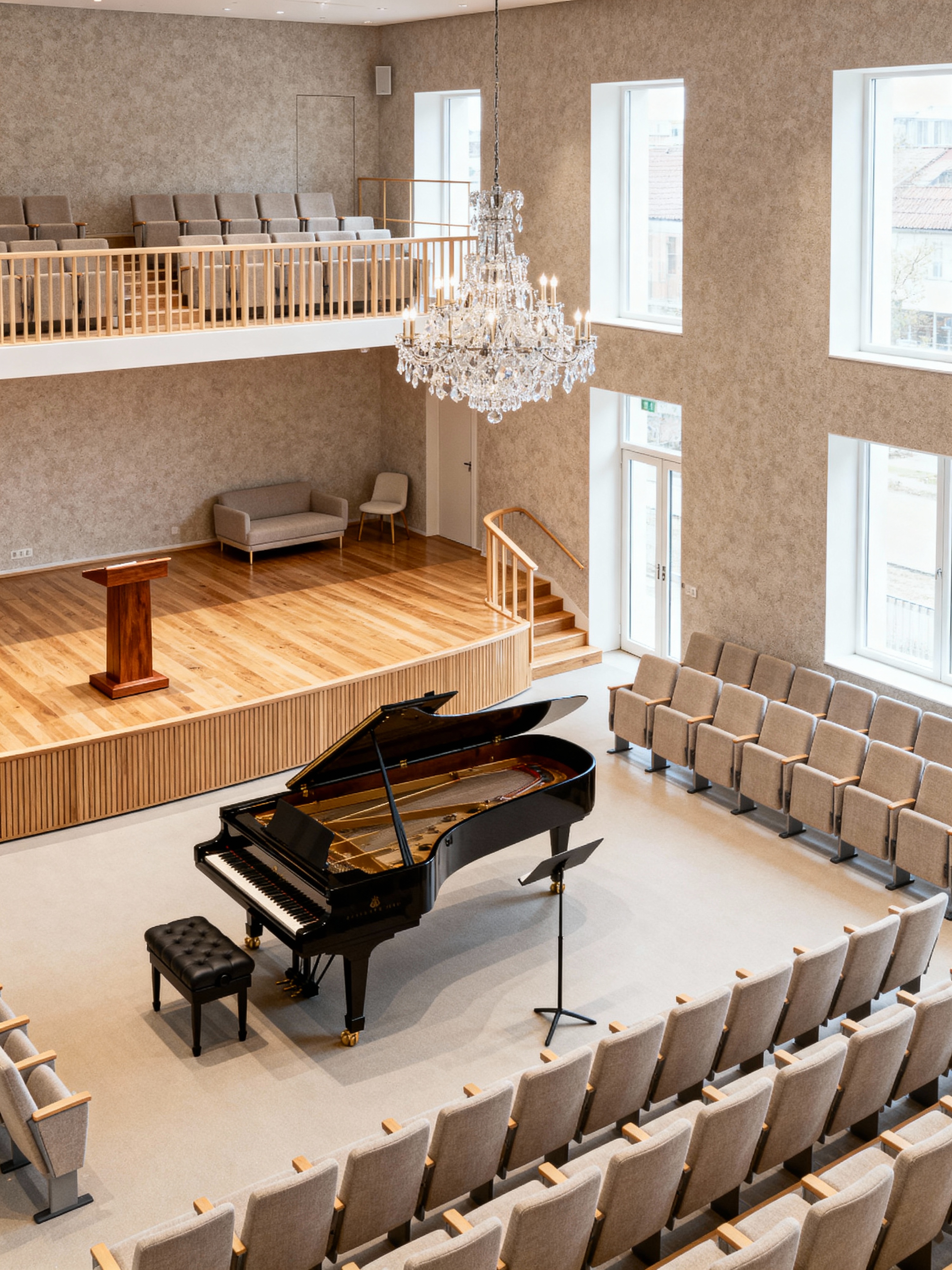 concert hall with airbnb style with grand piano and elegant decor and orchestra seats and conductor podium and chandelier and orchestra pit and stage and balcony seating. . with simple, clean lines and simplistic furniture and neutral walls and textures and open and natural lighting and simple color palette and practicality and functionality and natural materials and elements and scandinavian style and simple, clean lines and simplistic furniture