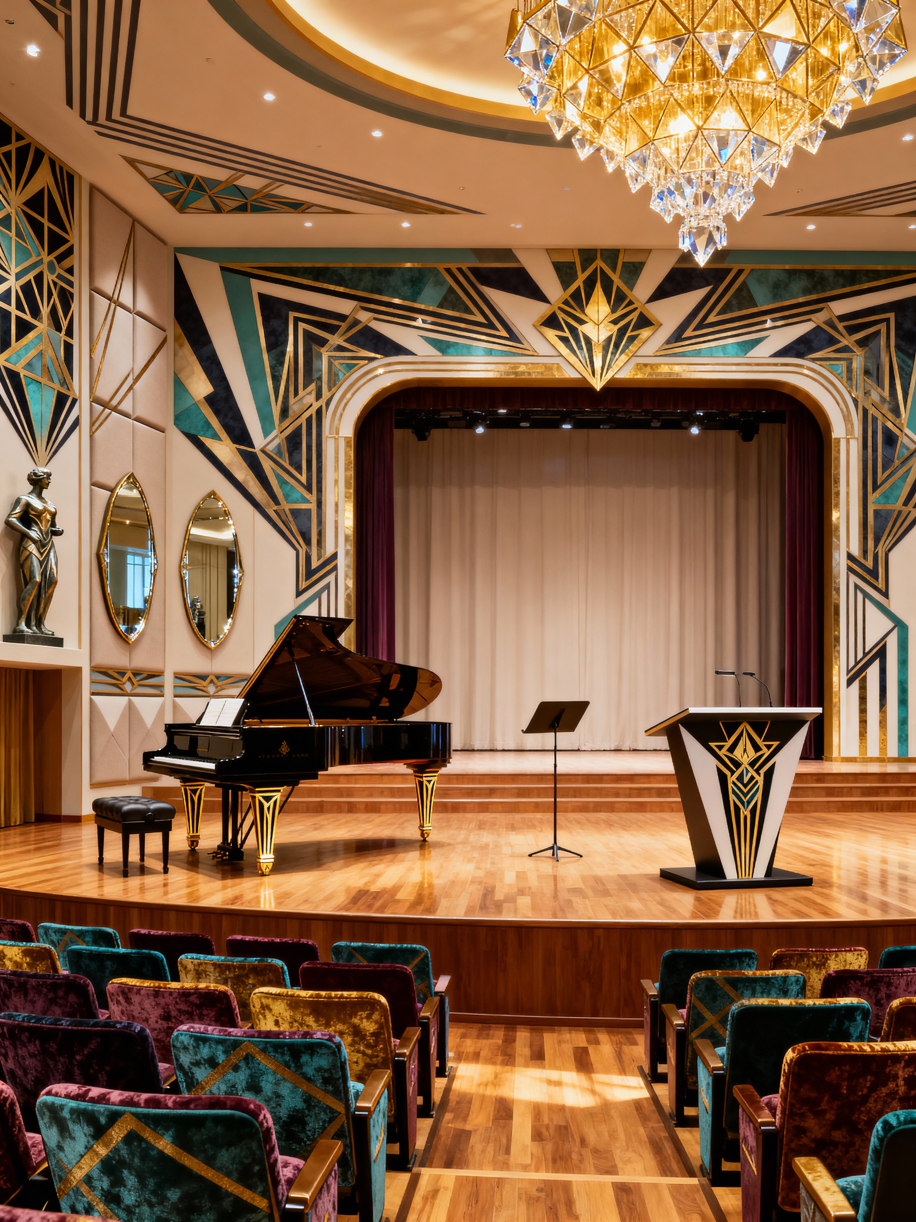 concert hall with art deco style with acoustic panels and elegant decor and grand piano and orchestra seats and chandelier and stage and conductor podium and music stands. . with geometric lines and rich colors and luxury and decadent detail and bright and cheerful colors and abstract patterns and angular shapes and glamour