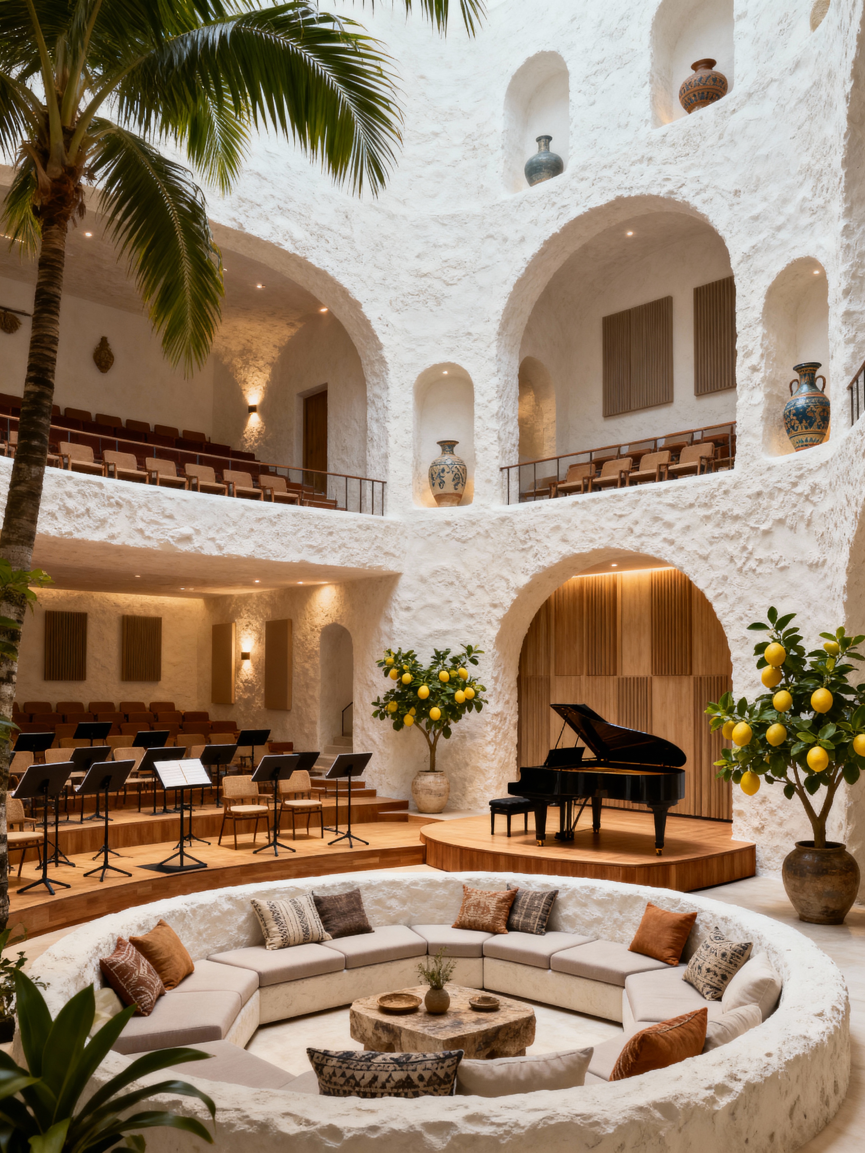 concert hall with bali style with orchestra pit and balcony seating and conductor podium and acoustic panels and elegant decor and orchestra seats and music stands and grand piano. . with conversation pit with pillows and low modular sofas and textured plaster or stucco finish and modern boho chic and white or cream walls and handcrafted pottery and vases and arched walls and niches and lush tropical plants (palms, lemon trees)