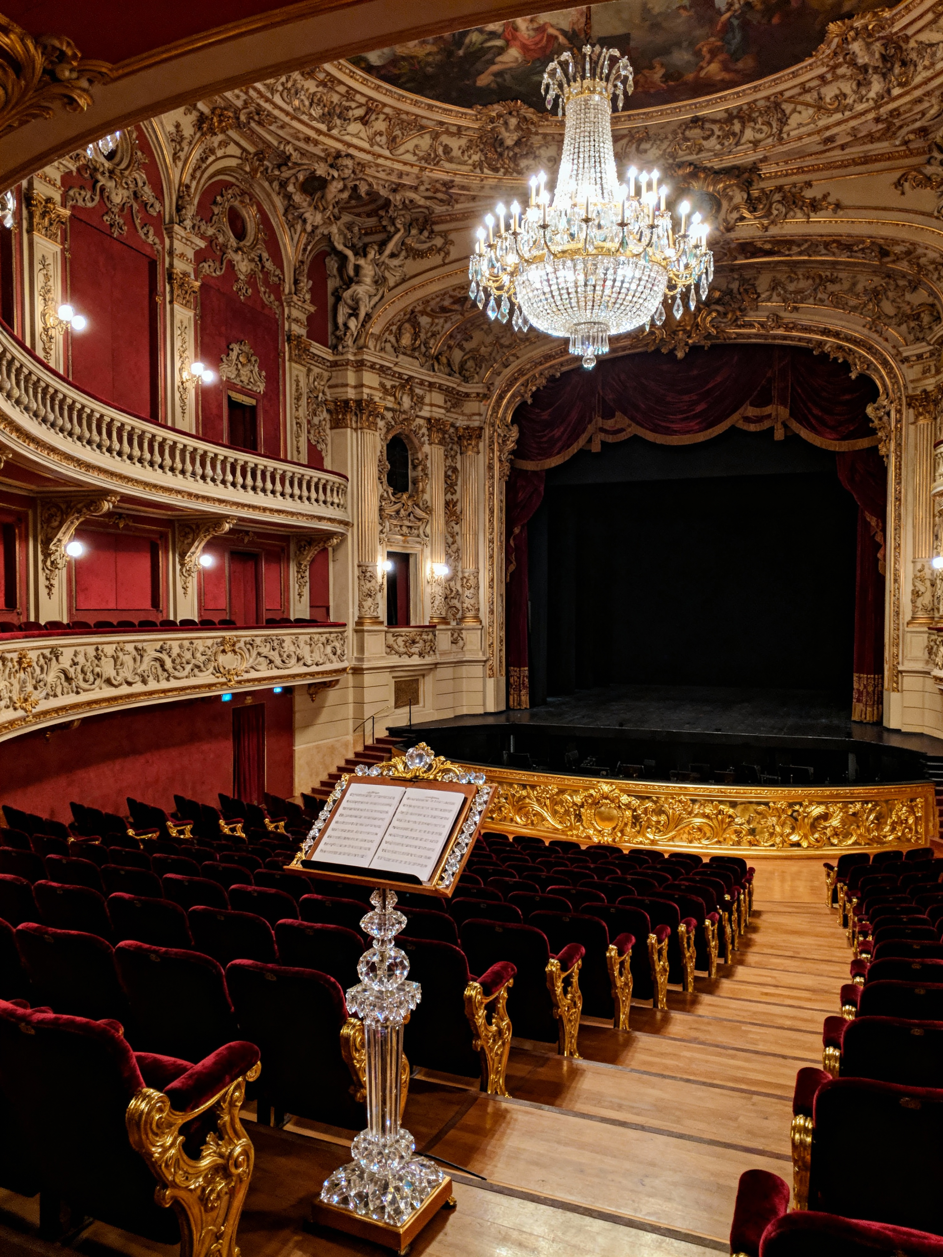 concert hall with baroque style with acoustic panels and music stands and conductor podium and balcony seating and chandelier and orchestra pit and orchestra seats and stage. . with emotional exuberance and sensuous richness and intricate carvings and ornaments and crystal and glass accents and grandeur and tension and opulent and colossal furniture and drama