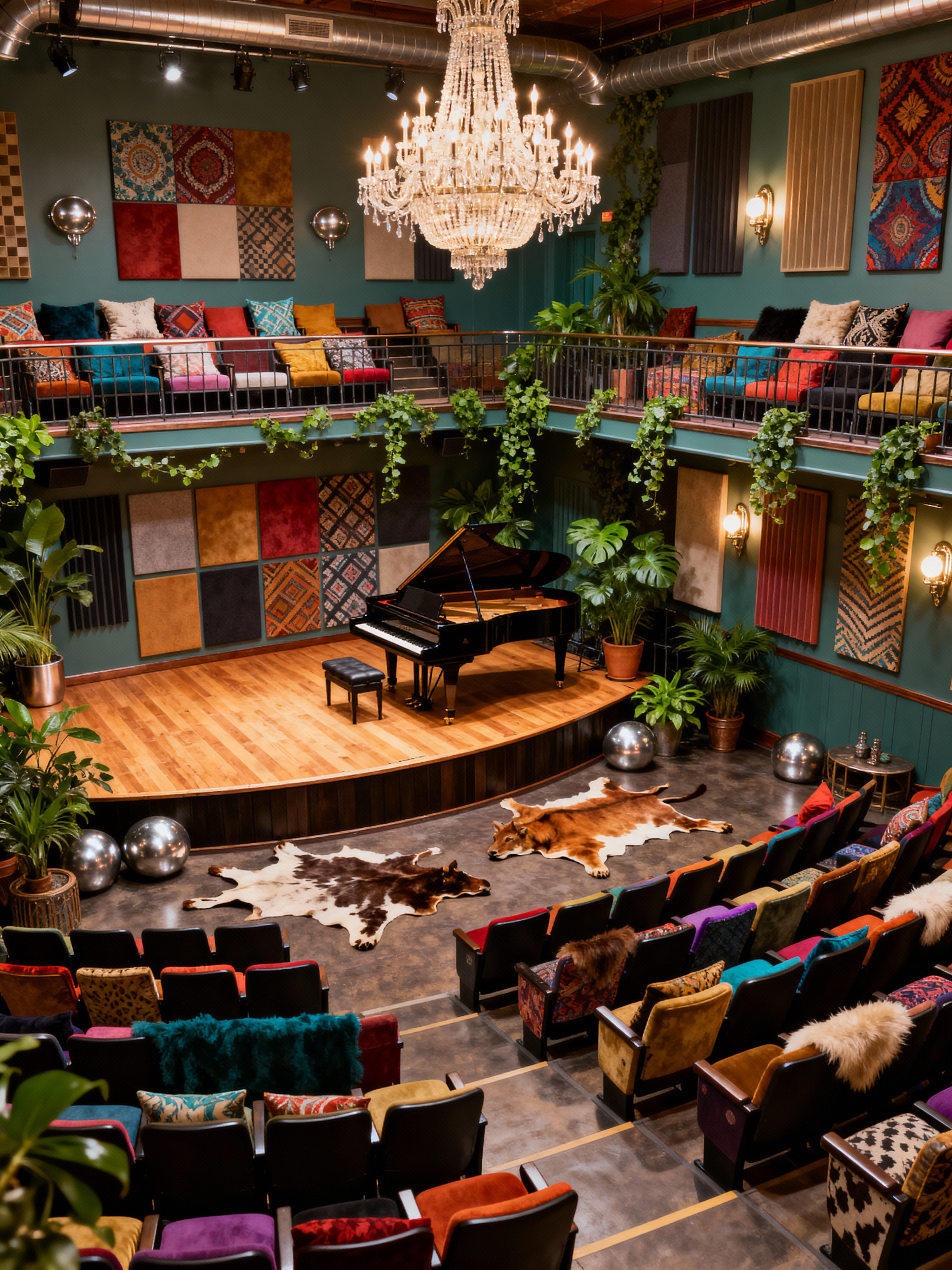 concert hall with bohemian style with elegant decor and chandelier and grand piano and balcony seating and orchestra seats and acoustic panels and stage and orchestra pit. . with animal hides and lush green nature and metals and bold patterns and a lack of structure and mixed patterns and playful colors and playful textures