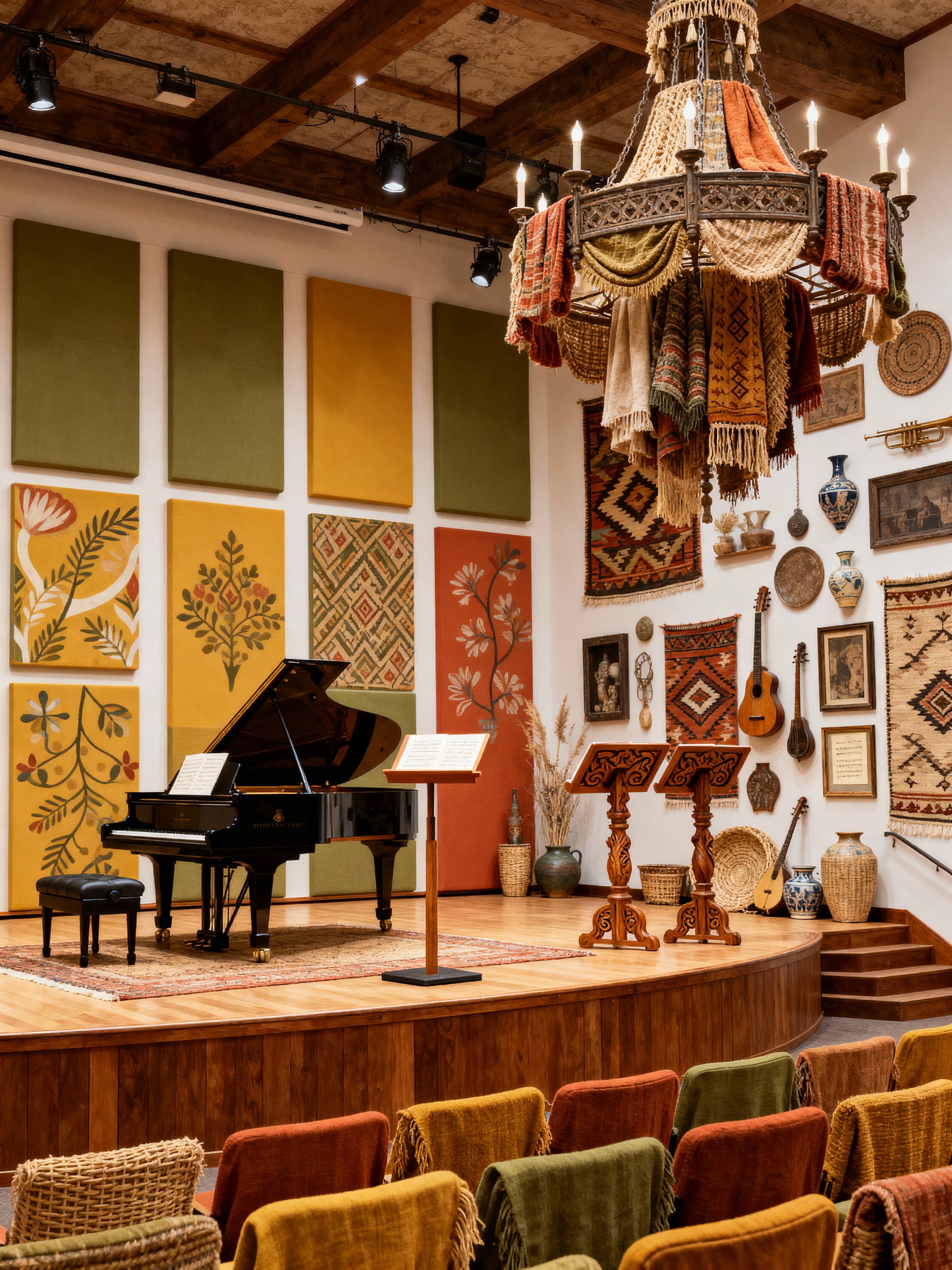 concert hall with boho-chic style with conductor podium and acoustic panels and grand piano and stage and chandelier and music stands and orchestra pit and orchestra seats. . with natural materials and artistic touches and eclectic mix and bohemian flair and free-spirited and earthy colors and global artifacts and vintage finds