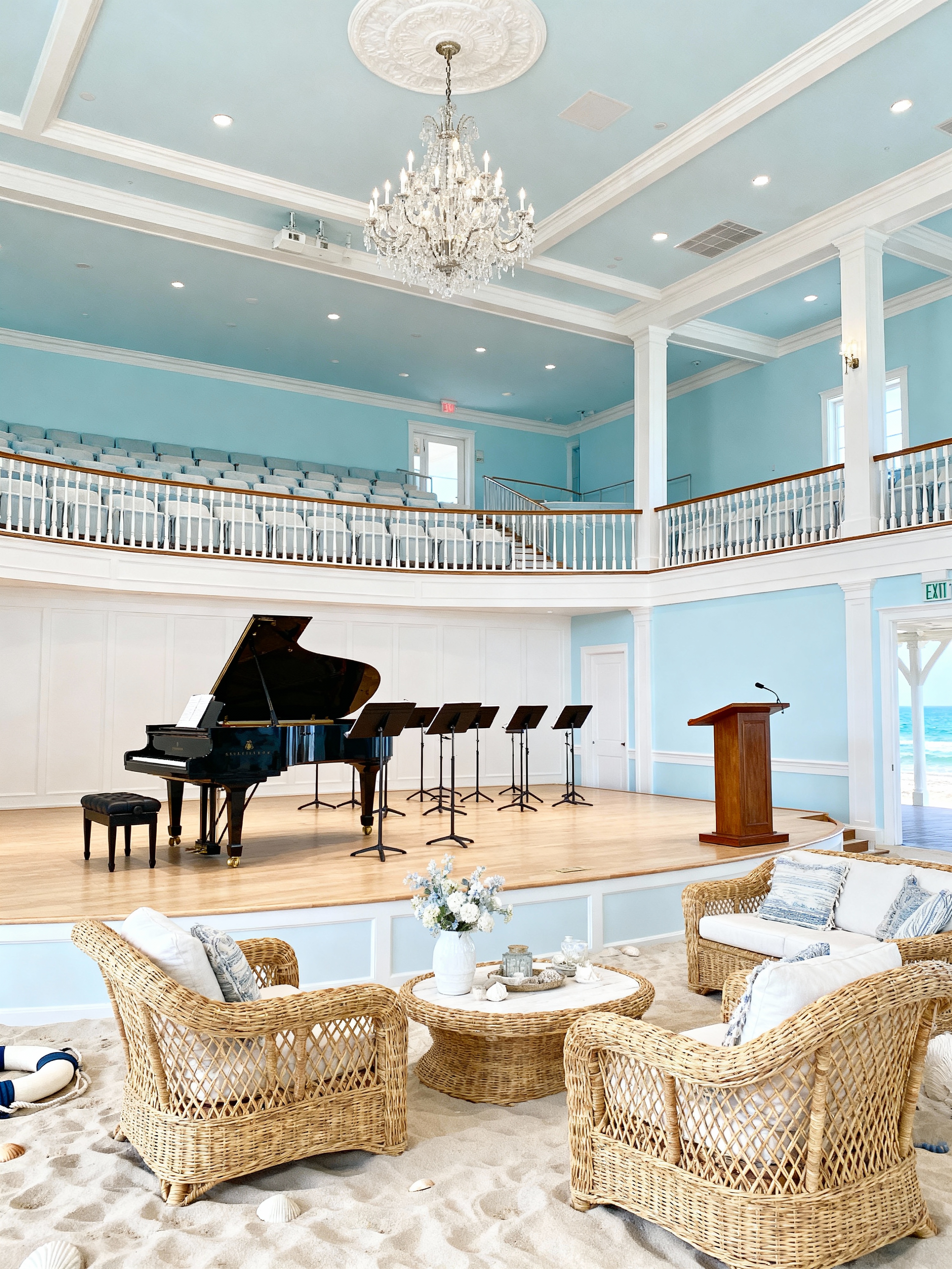 concert hall with coastal style with elegant decor and grand piano and music stands and stage and orchestra pit and balcony seating and chandelier and conductor podium. . with light blue and seaside colors and natural materials and airy feel and wicker furniture and beach vibes and nautical decor and white decor