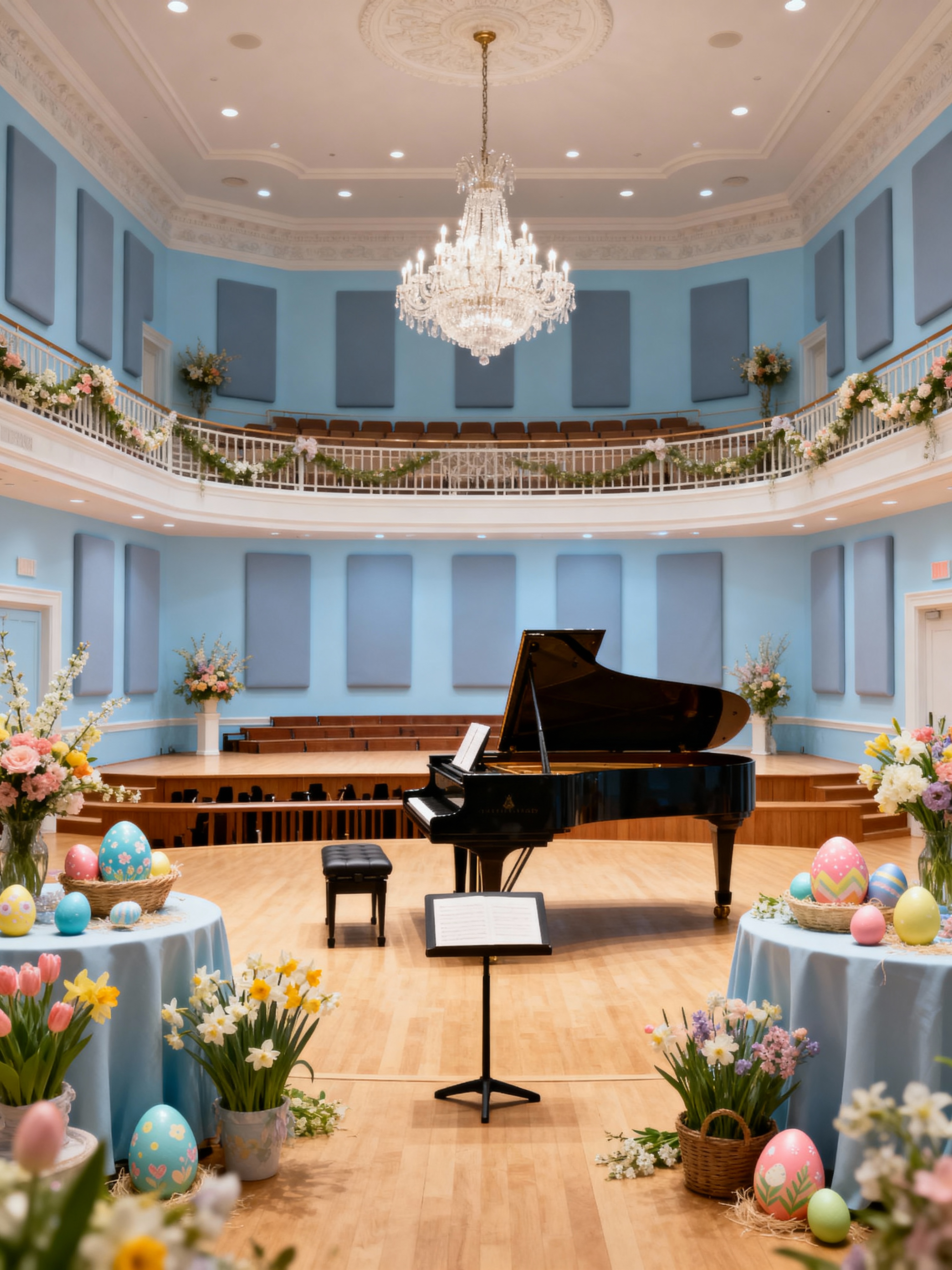 concert hall with easter style with grand piano and conductor podium and stage and chandelier and orchestra pit and elegant decor and balcony seating and acoustic panels. . with light blue colors and easter decorations and spring decorations and colorful easter eggs and flowers on table and light blue colors