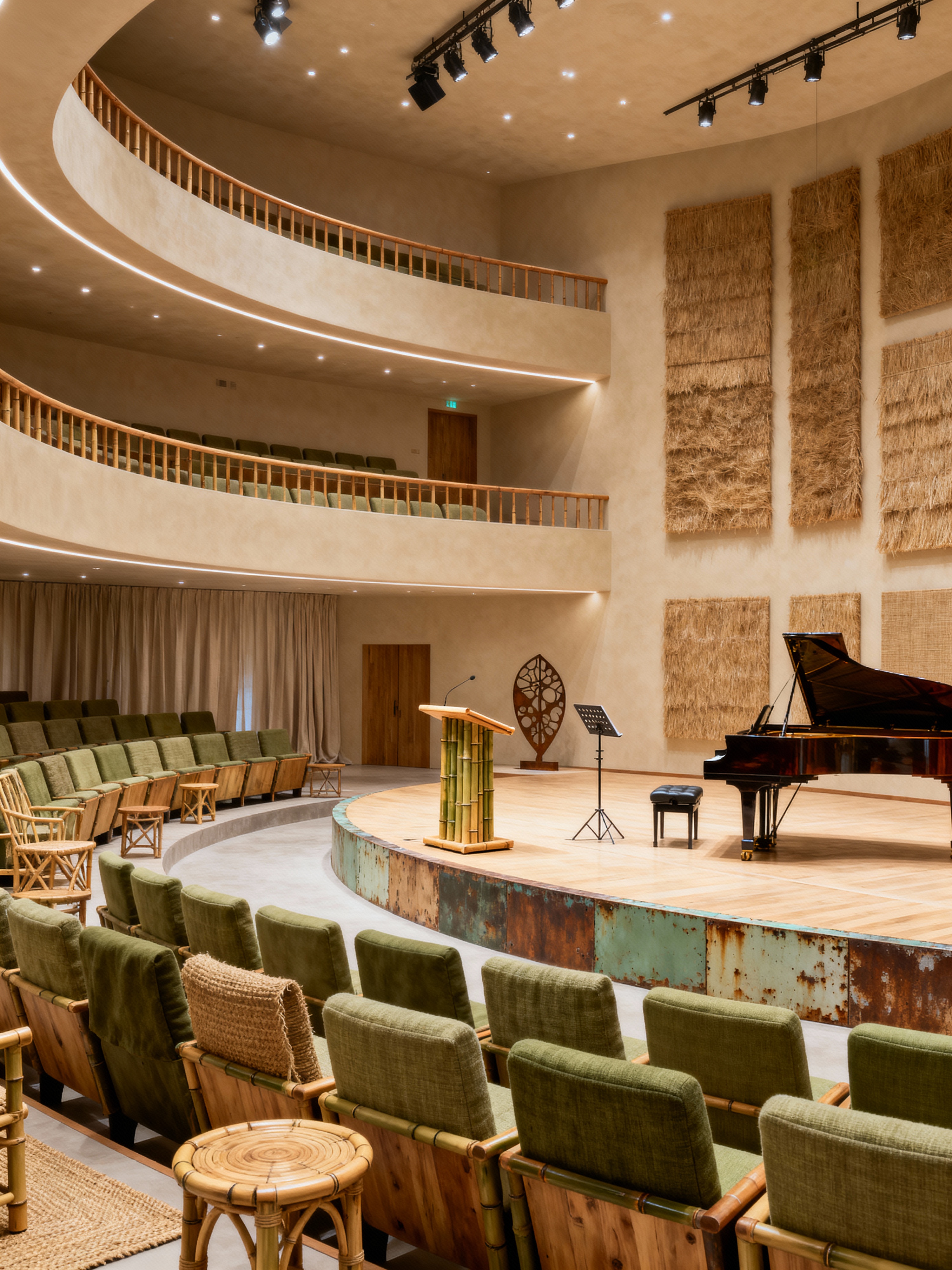 concert hall with eco-friendly style with balcony seating and conductor podium and orchestra pit and orchestra seats and acoustic panels and elegant decor and grand piano and music stands. . with environmentally conscious and organic textiles and energy efficient and green living and non-toxic finishes and natural fibers and bamboo furniture and recycled elements