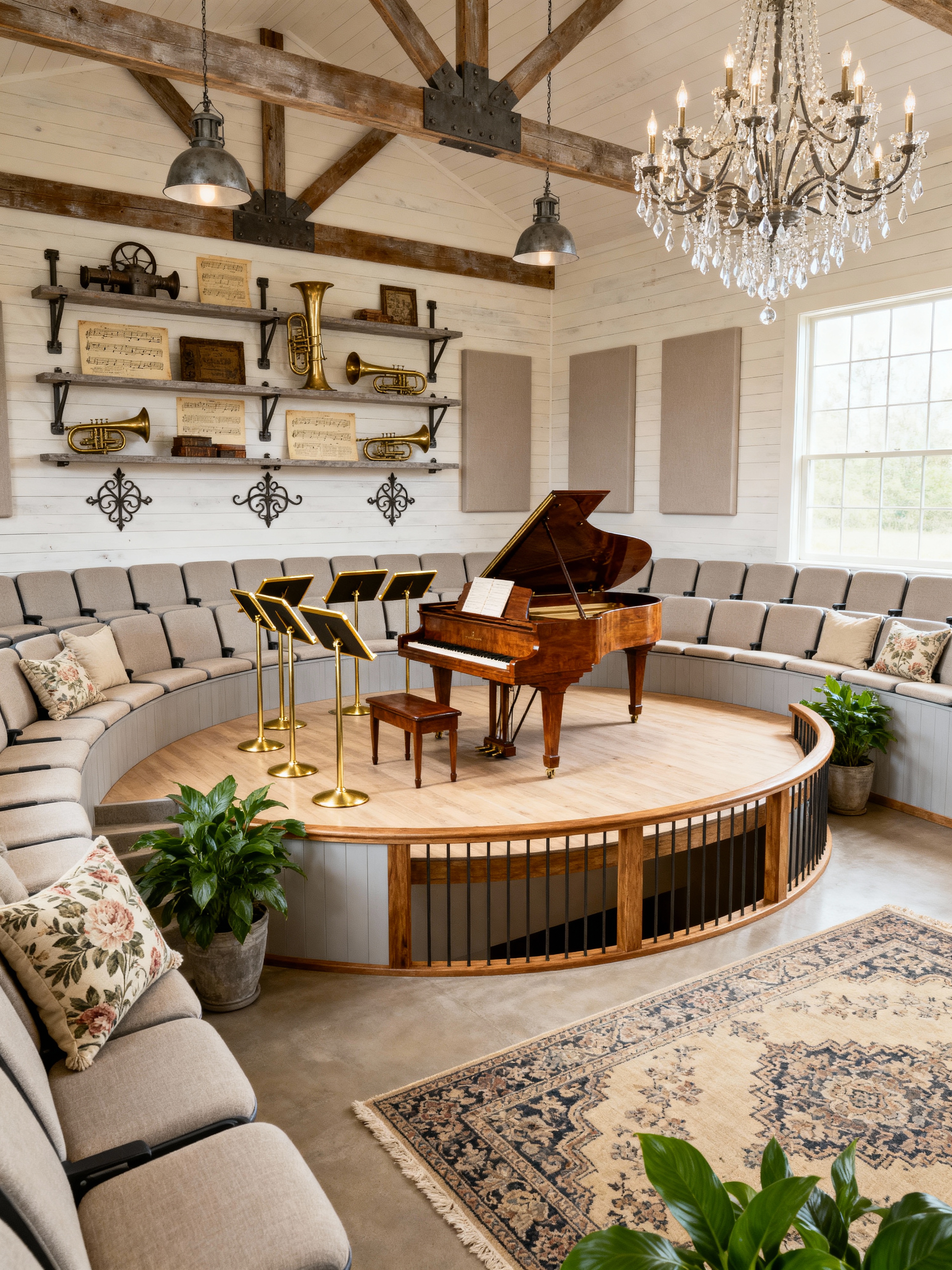 concert hall with farmhouse style with music stands and stage and acoustic panels and chandelier and grand piano and orchestra seats and orchestra pit and elegant decor. . with country style and open shelving and vintage decor and industrial accents and shiplap walls and exposed wood and cozy feel and neutral tones