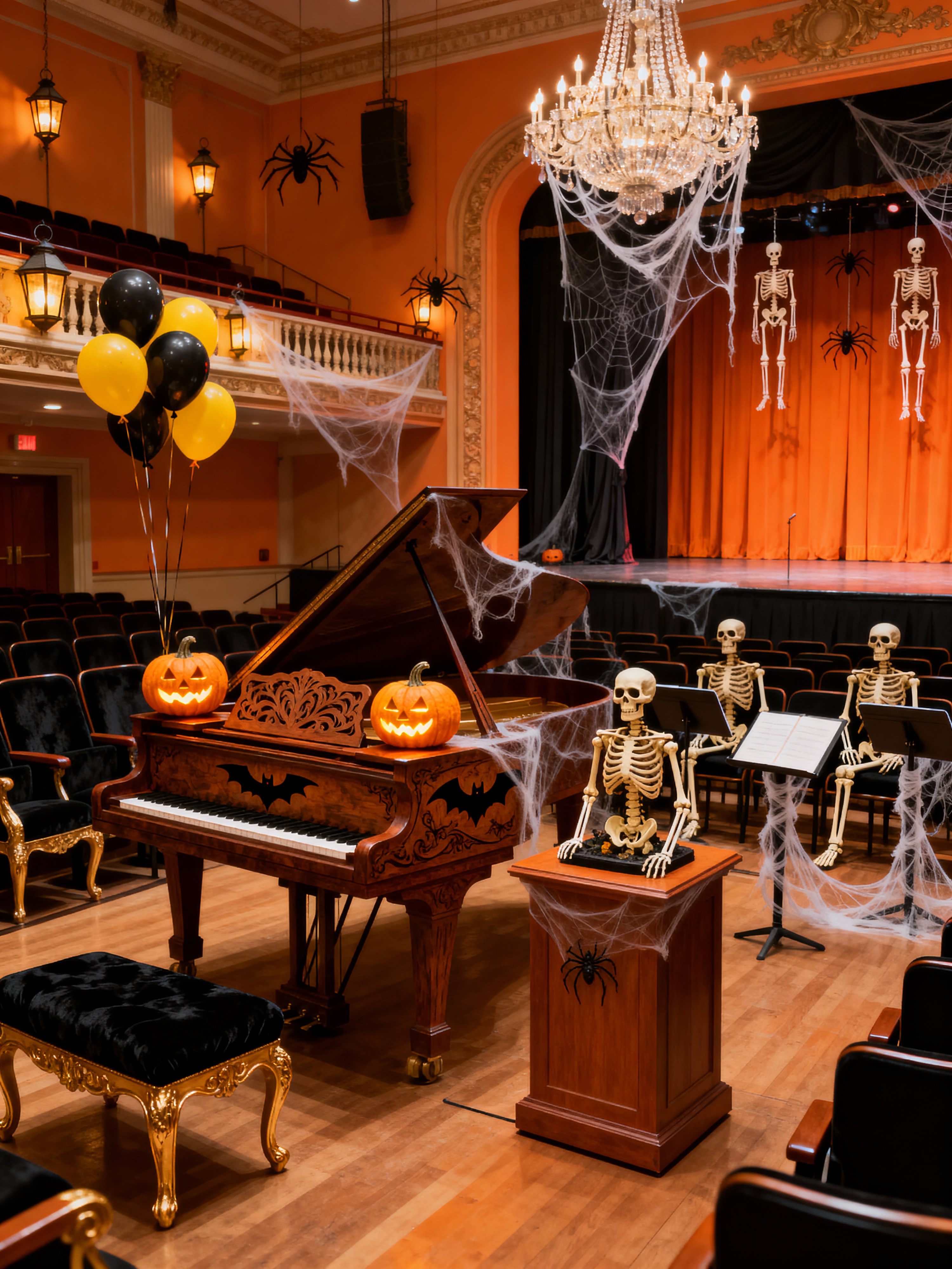 concert hall with halloween style with grand piano and elegant decor and chandelier and orchestra seats and conductor podium and music stands and balcony seating and stage. . with lanterns and skeletons sitting and standing and spiderwebs and lanterns and cobwebs and cobwebs and yellow black balloons and glowing pumpkins