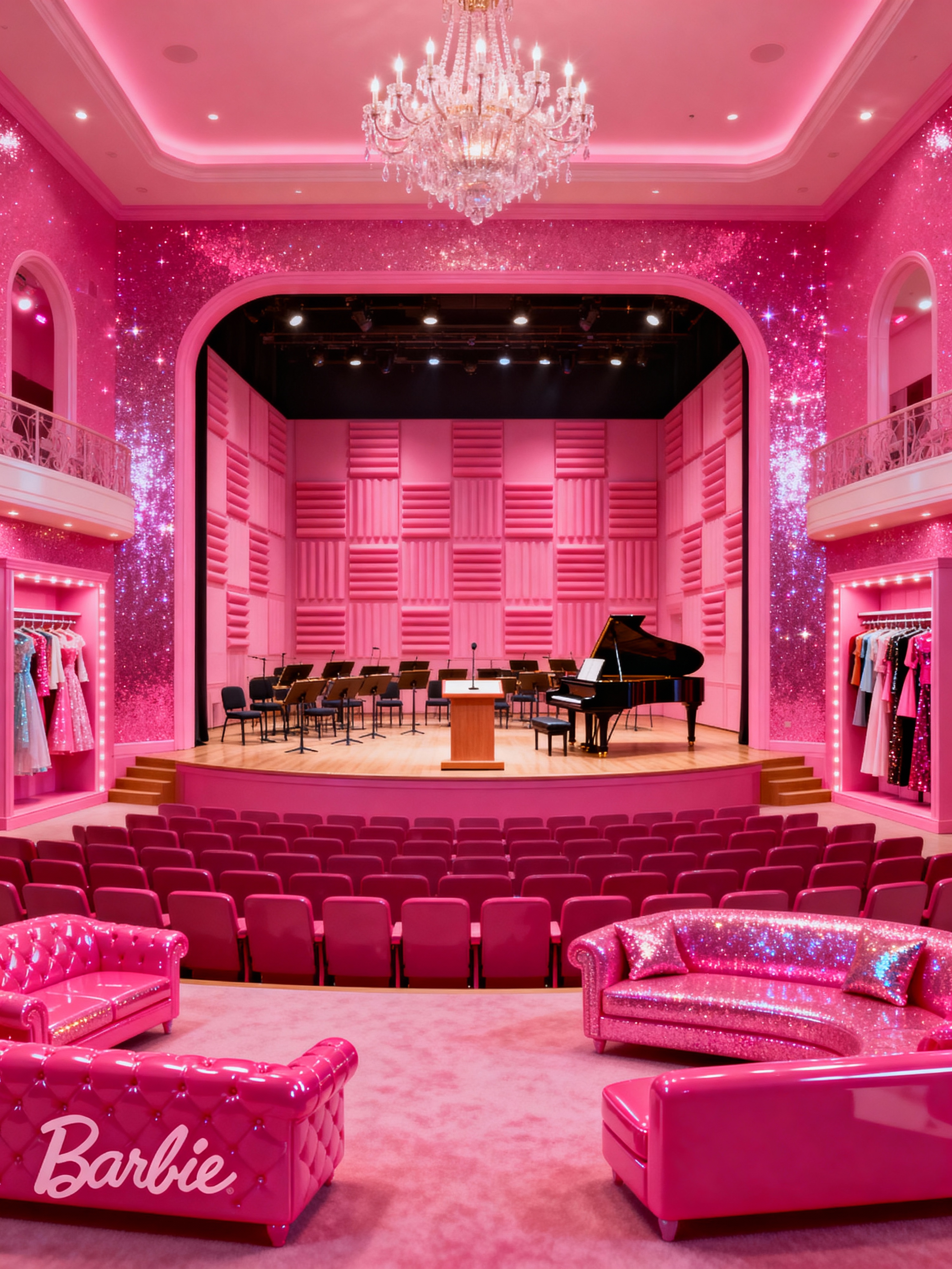 concert hall with hot pink style with elegant decor and stage and acoustic panels and orchestra pit and grand piano and chandelier and conductor podium and orchestra seats. . with barbie closet and barbie style interior and hot pink barbie walls and barbie glitter and sparkle and barbie sofa and barbie bold rosy hues like fuchsia and magenta and barbie plastic interior and hot pink barbie colors